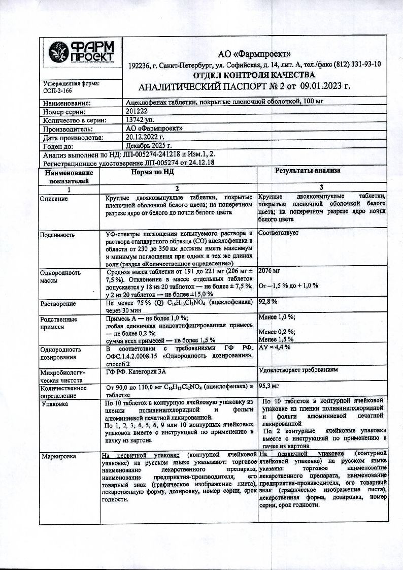 Ацеклофенак 100 мг 20 шт таблетки покрытые пленочной оболочкой