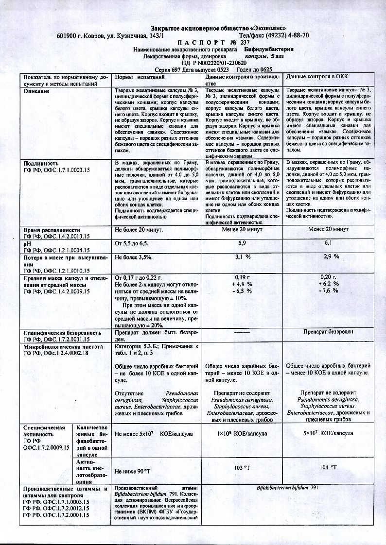Бифидумбактерин 5 доз 10 шт лиофилизат для приготовления раствора для приема внутрь и местного применения флакон
