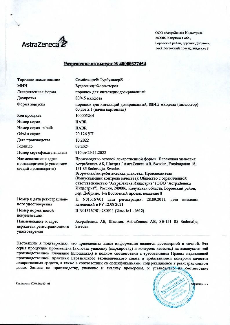 Симбикорт Турбухалер 80 мкг + 4,5 мкг 60 доз порошок для ингаляций дозированный