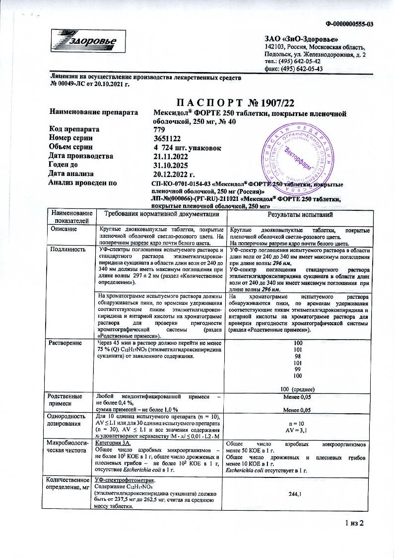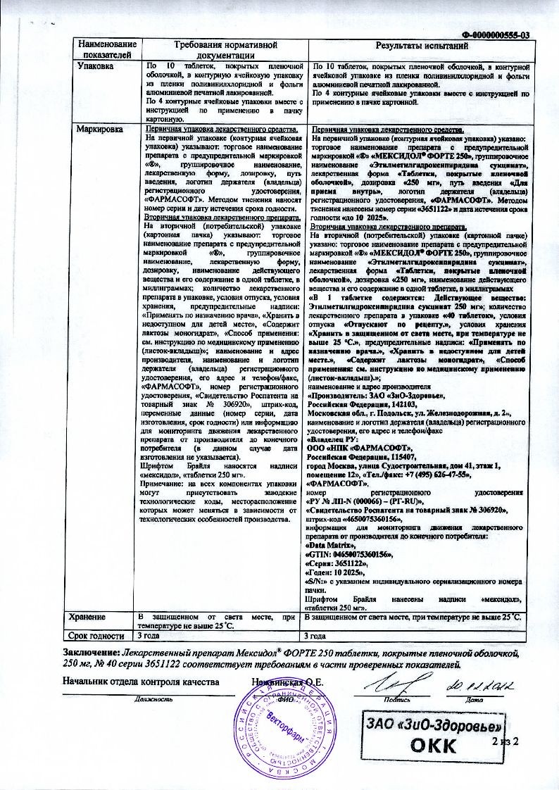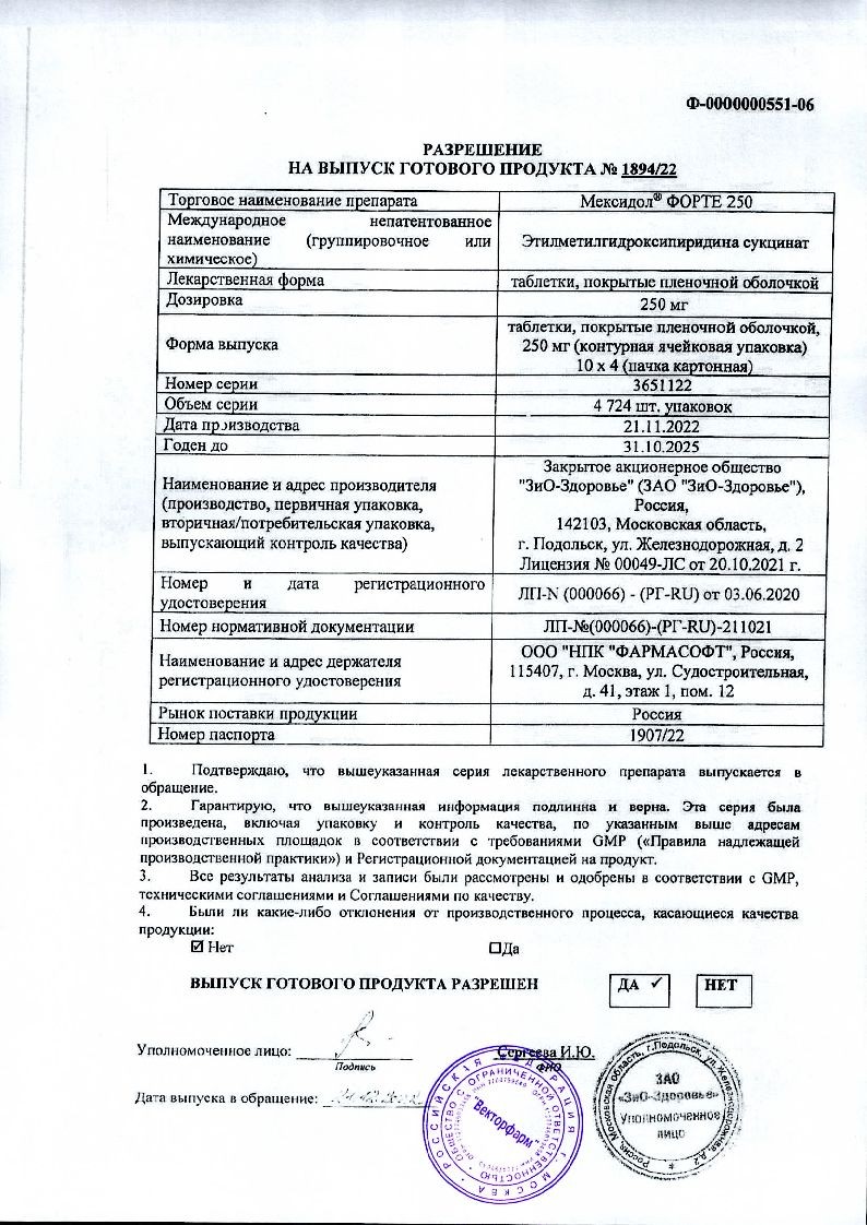 Мексидол форте 250 мг 40 шт таблетки покрытые оболочкой