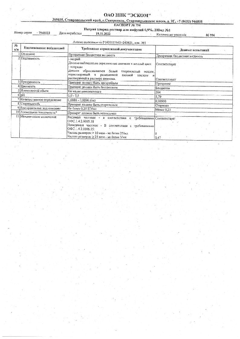 Натрия хлорид 0,9 % 200 мл раствор для инфузий флакон полимерный