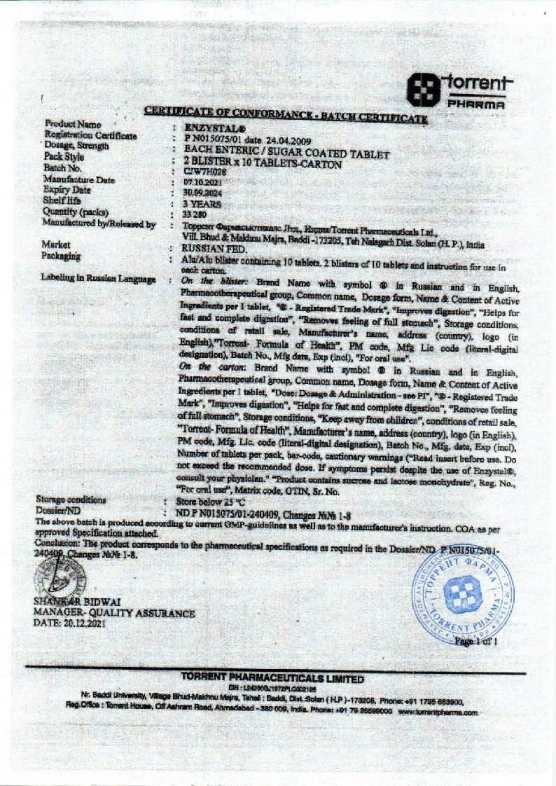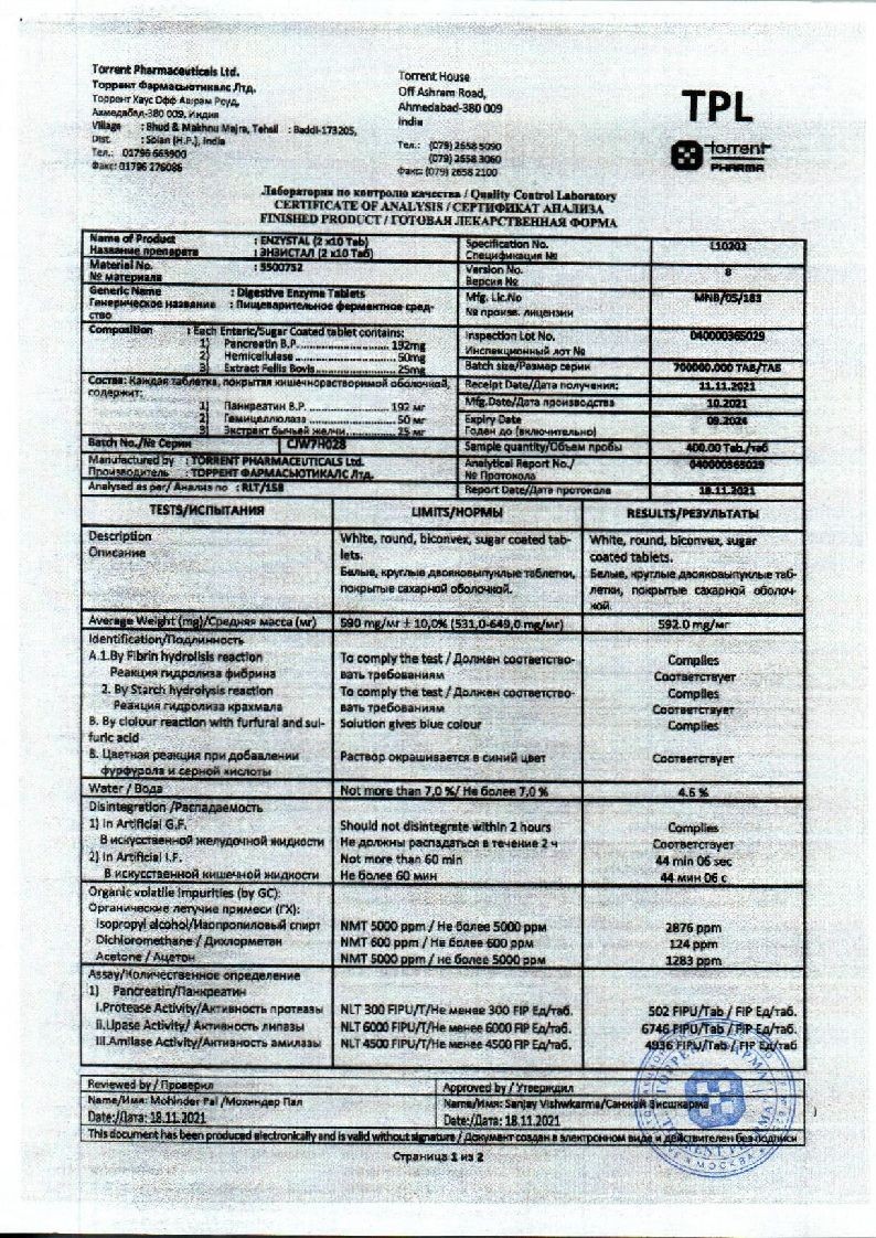 Энзистал 20 шт таблетки покрытые кишечнорастворимой оболочкой