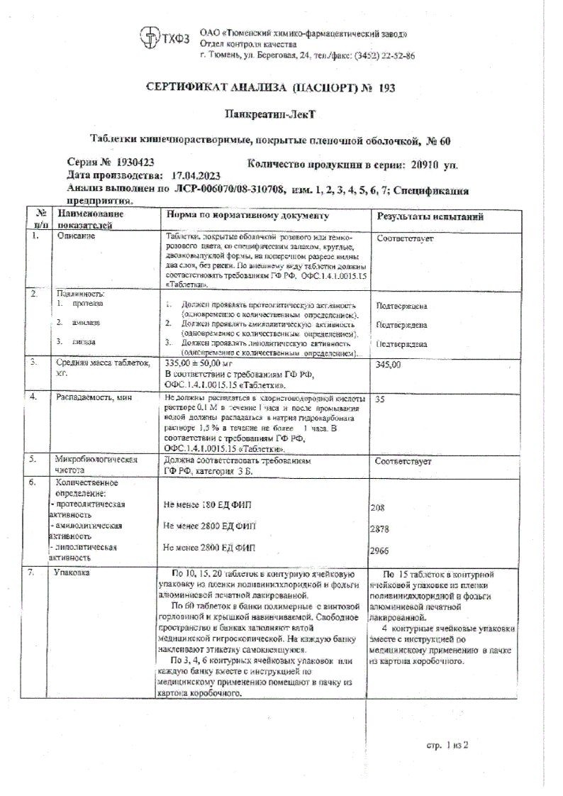 Панкреатин-ЛекТ 60 шт таблетки кишечнорастворимые покрытые пленочной оболочкой