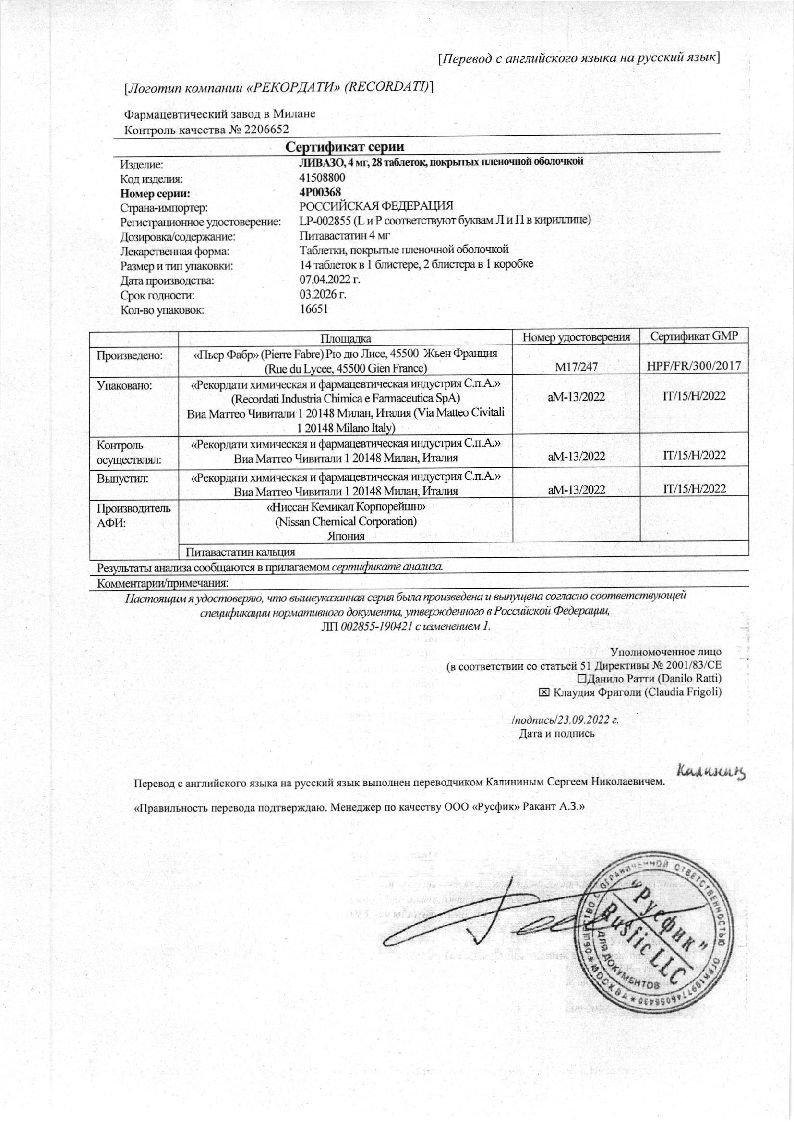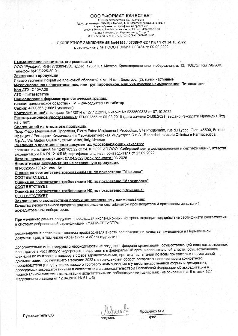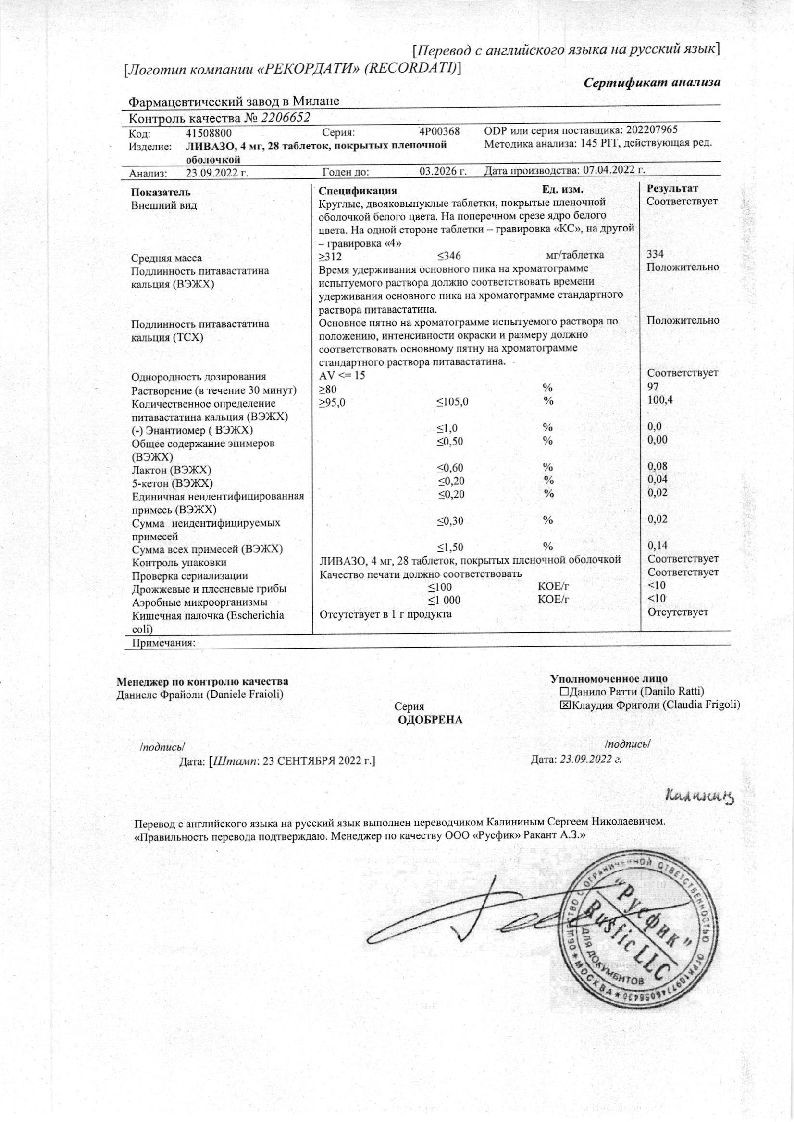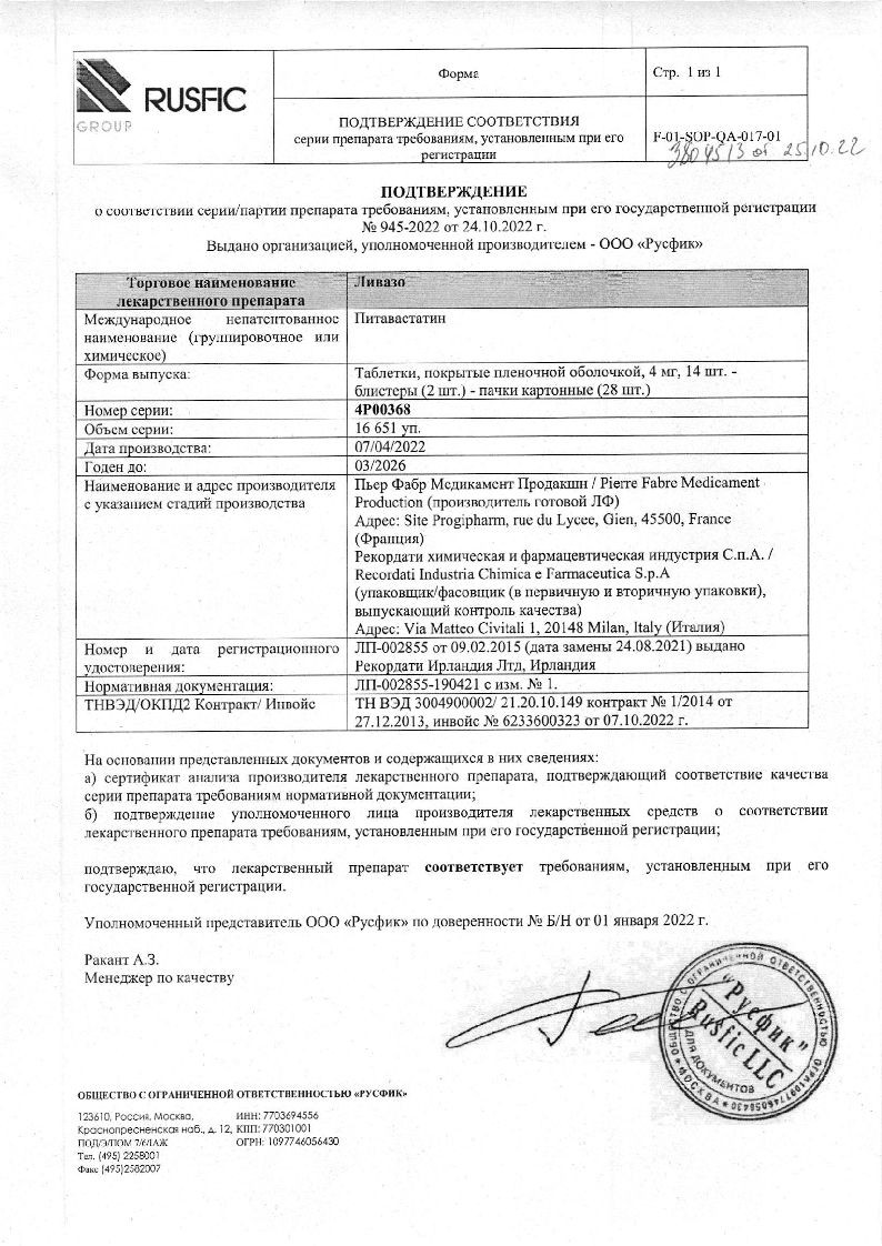 Ливазо 4 мг 28 шт таблетки покрытые пленочной оболочкой