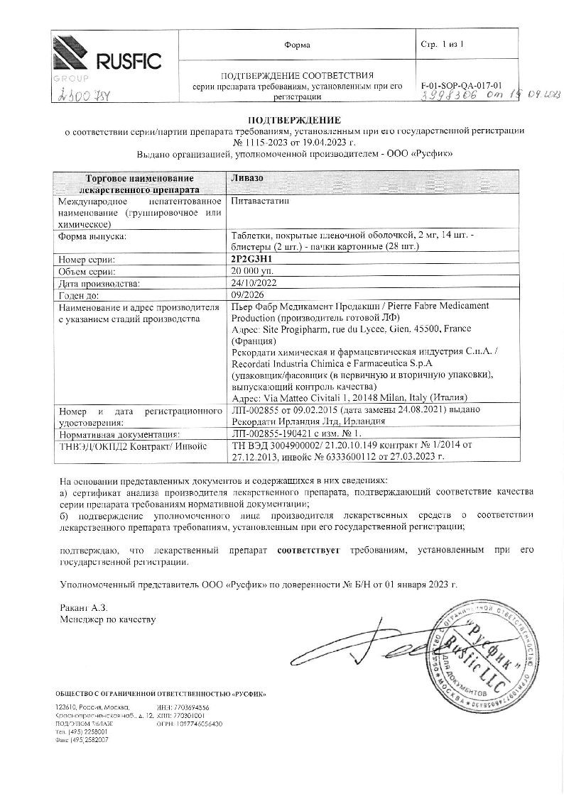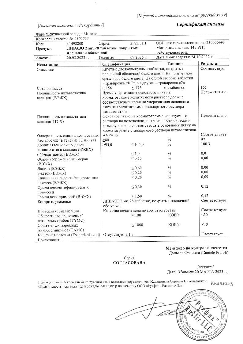 Ливазо 2 мг 28 шт таблетки покрытые пленочной оболочкой