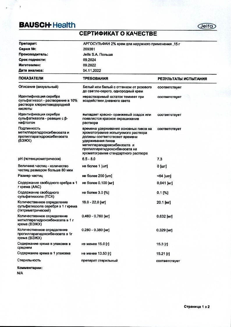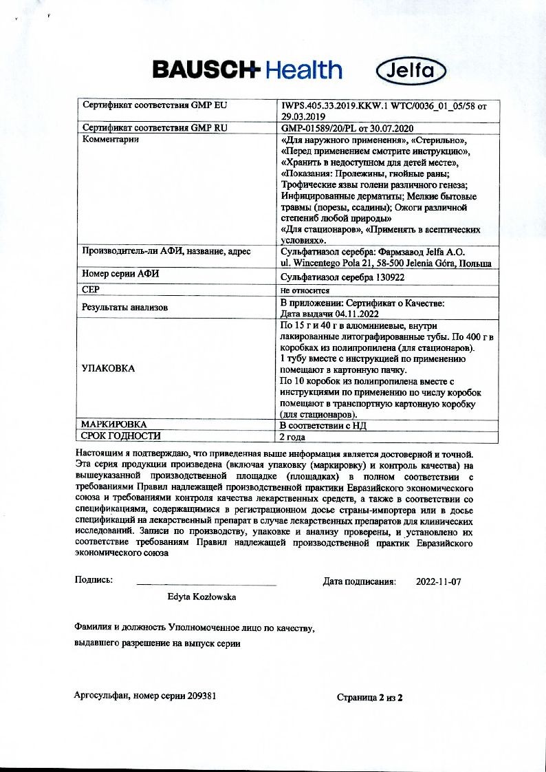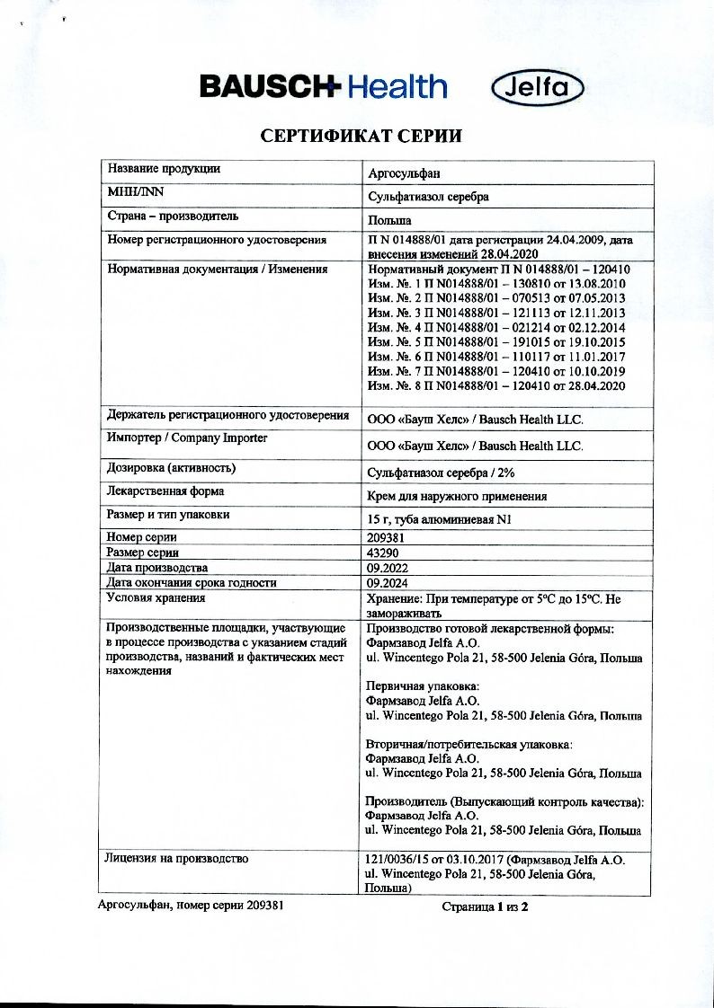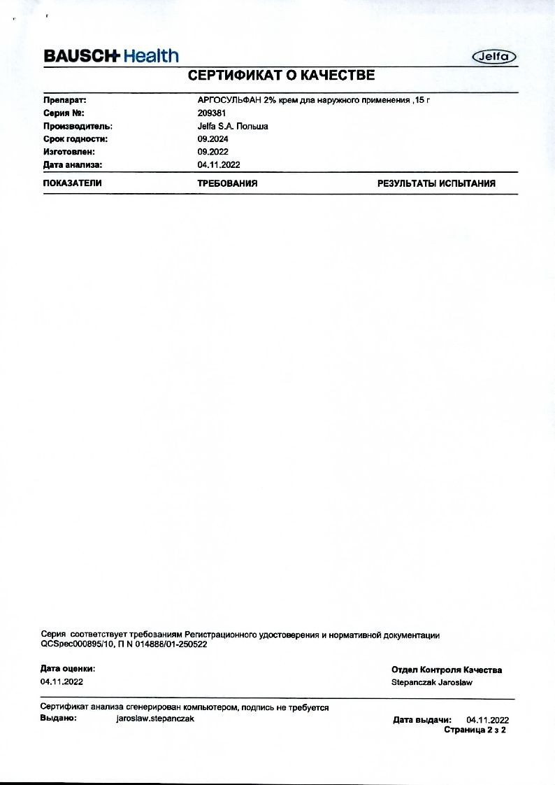Аргосульфан 2% 15 г крем для наружного применения