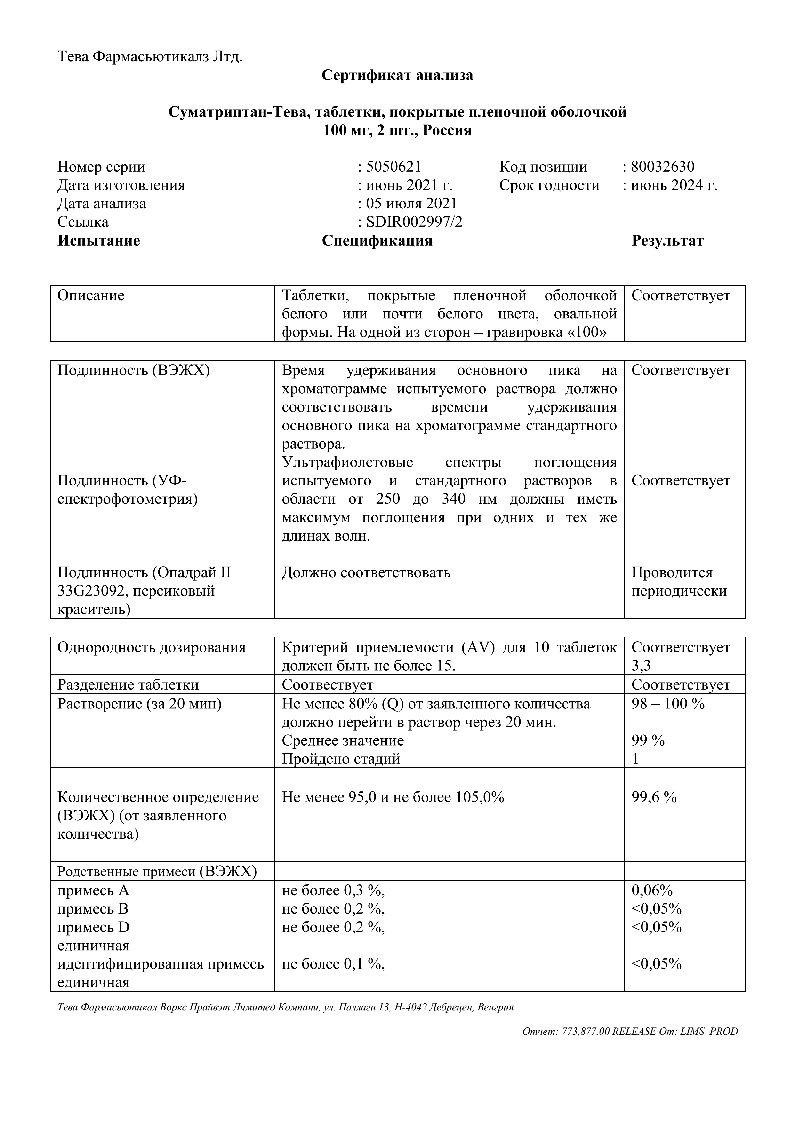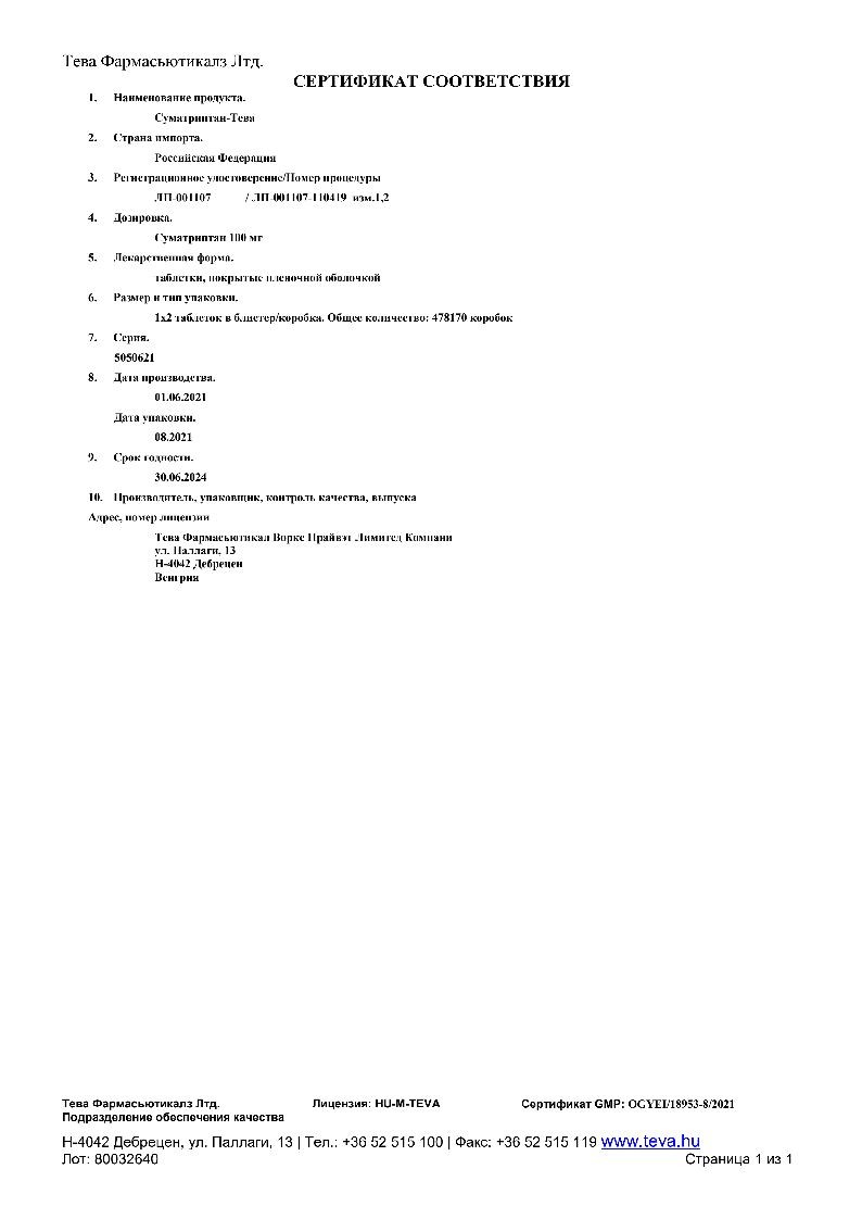 Суматриптан-Тева 100 мг 6 шт таблетки покрытые пленочной оболочкой