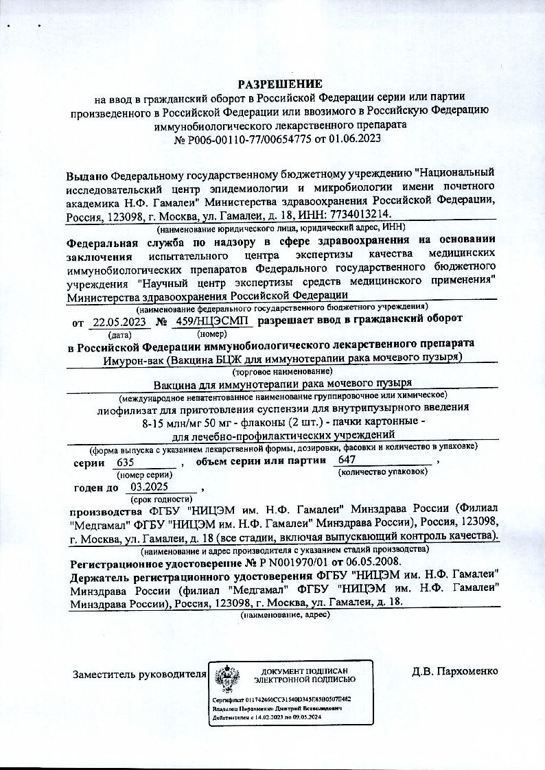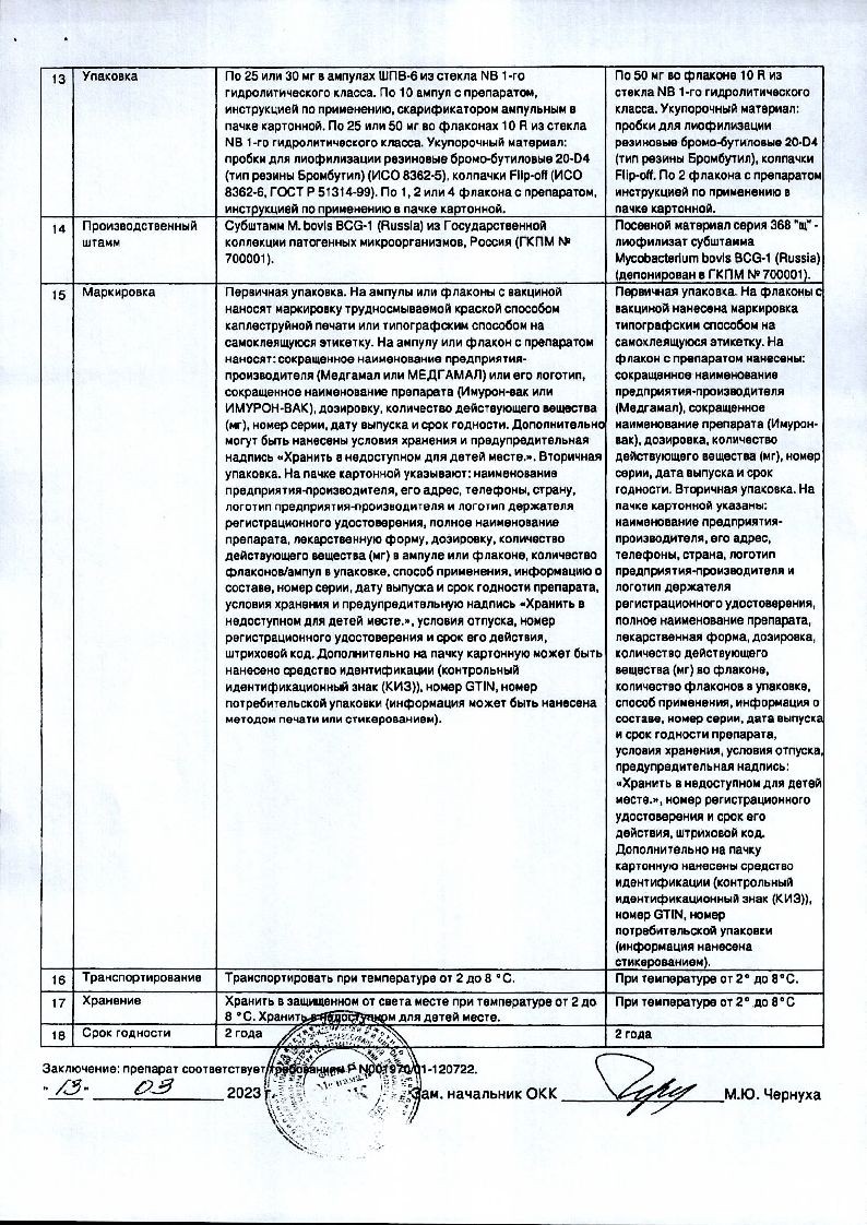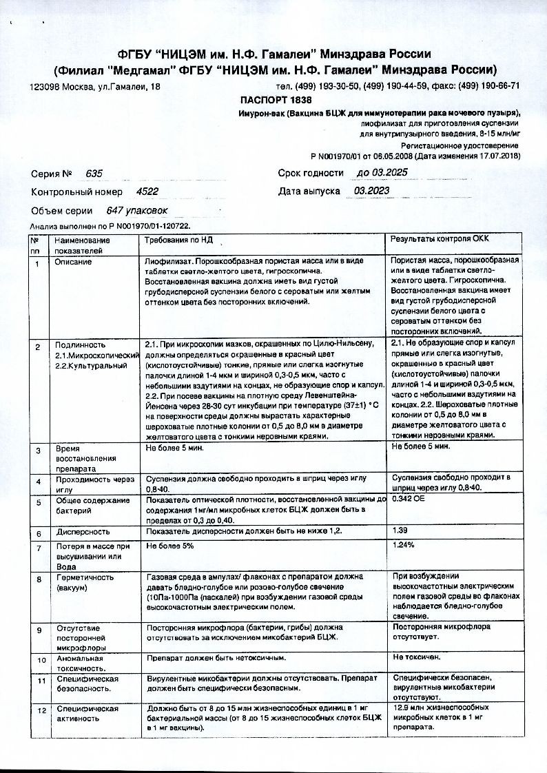Имурон-Вак (вакцина БЦЖ для иммунотерапии рака мочевого пузыря) 50 мг 8,15 мл 2 шт лиофилизат для суспензии для внутрипузырного введения