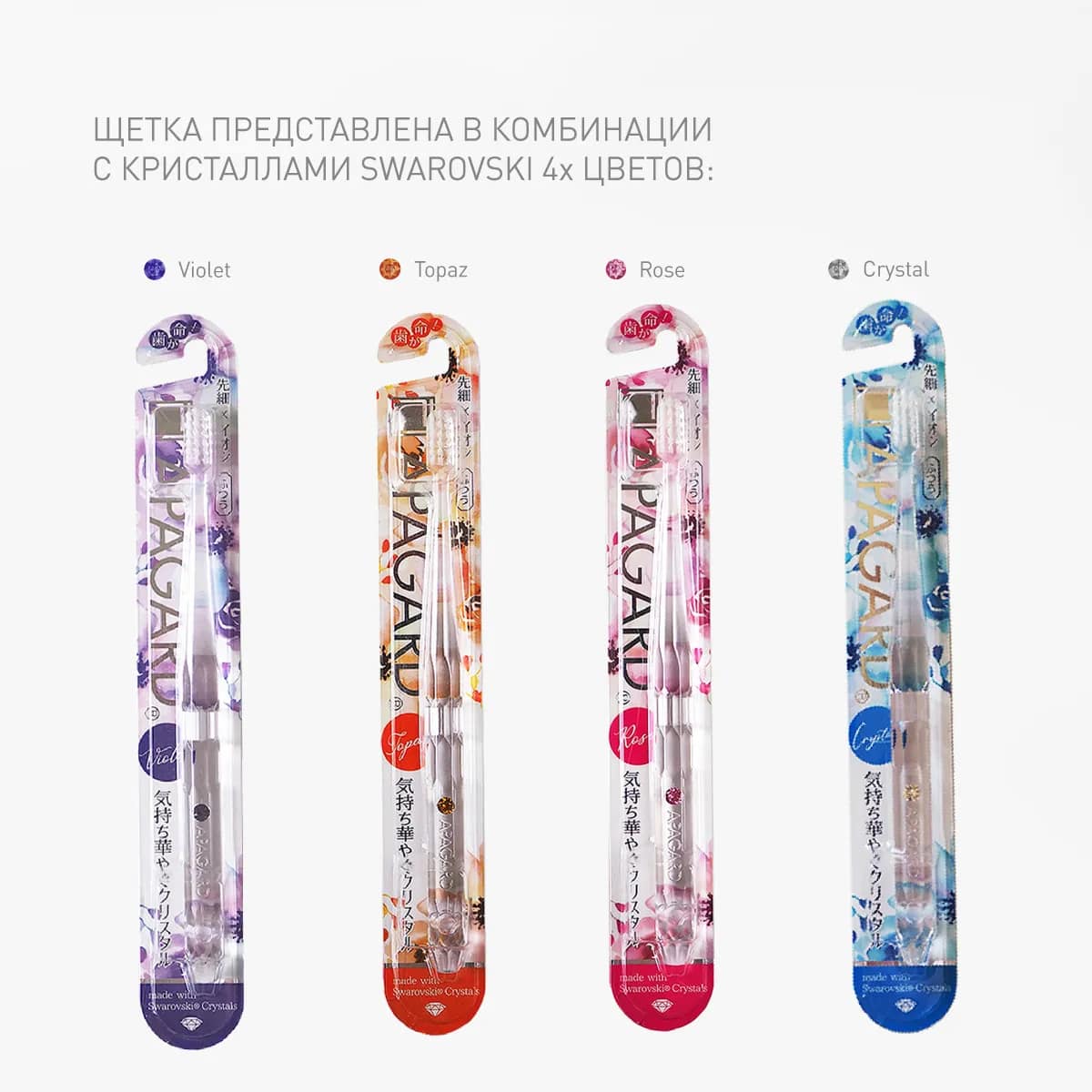 Отбеливающая зубная щетка Apagard разработанная для бережного и эффективного очищения зубов, десен и межзубных промежутков. Щетка представлена в комбинации с кристаллами Swarovski трех цветов: рубин, сапфир, бриллиант.