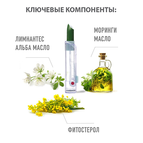 Моринги масло, воски канделильский и карнаубский - источники витаминов, антиоксидантов, фитостеролов, цитокининов, жирных кислот. Обеспечивают защиту, формируя на поверхности губ тонкую защитную пленку