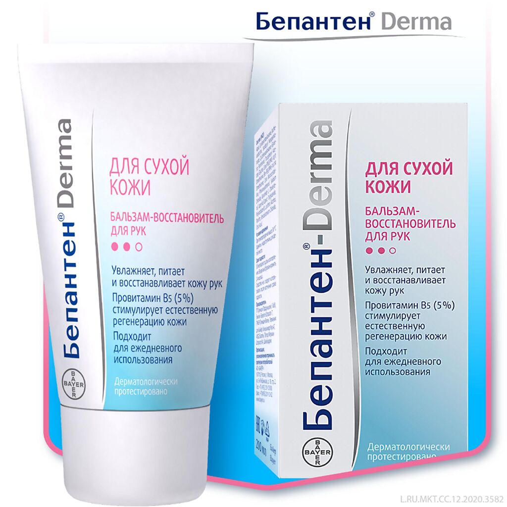 Бепантен Derma Бальзам-Восстановитель для рук Содержит провитамин B5 в высокой концентрации (5%), благодаря чему способствует глубокому увлажнению и запускает естественные процессы восстановления кожи. Интенсивно смягчает, питает и восстанавливает кожу рук.