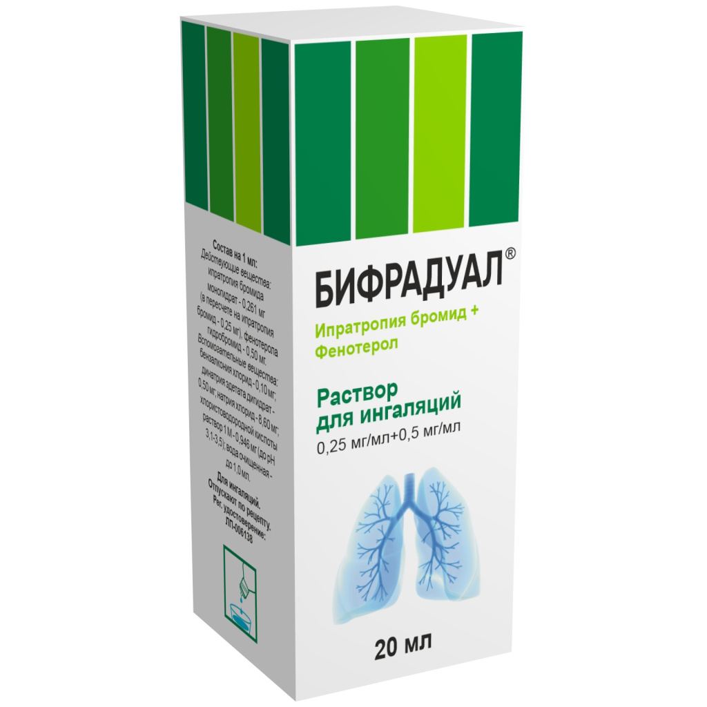 Препарат Бифрадуал® содержит два компонента, обладающих бронхолитической активностью: ипратропия бромид - М-холиноблокатор и фенотерол - β2-адреномиметик. Бронходилатация при ингаляционном введении ипратропия бромида обусловлена, главным образом, местным, а не системным антихолинергическим действием. Ипратропия бромид является четвертичным производным аммония, обладающим антихолинергическими (парасимпатолитическими) свойствами. Препарат Бифрадуал® тормозит рефлексы, вызываемые блуждающим нервом, противодействуя явлениям ацетилхолина-медиатора, высвобождающегося из окончаний блуждающего нерва. Антихолинергические средства предотвращают увеличение внутриклеточной концентрации ионов кальция, что происходит вследствие взаимодействия ацетилхолина с мускариновым рецептором, расположенным на гладких мышцах бронхов. Высвобождение ионов кальция опосредуется системой вторичных медиаторов, в число которых входит инозитола трифосфат (ИТФ) и диацилглицерин (ДАГ).