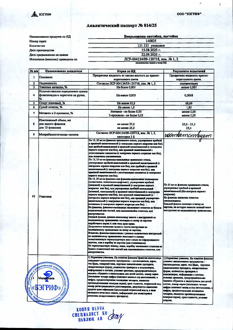 Сертификаты и лицензии “Боярышник 25 мл настойка флакон”