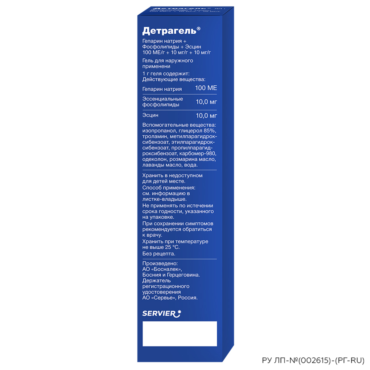 Комбинированный препарат, оказывает местное антикоагулянтное, противовоспалительное, венотонизирующее и антиагрегантное действие, снижает проницаемость вен, улучшает микроциркуляцию. Детрагель® содержит три действующих вещества: гепарин натрия, эссенциальные фосфолипиды и эсцин, которые обладают фармакодинамическим и фармакокинетическим синергизмом.