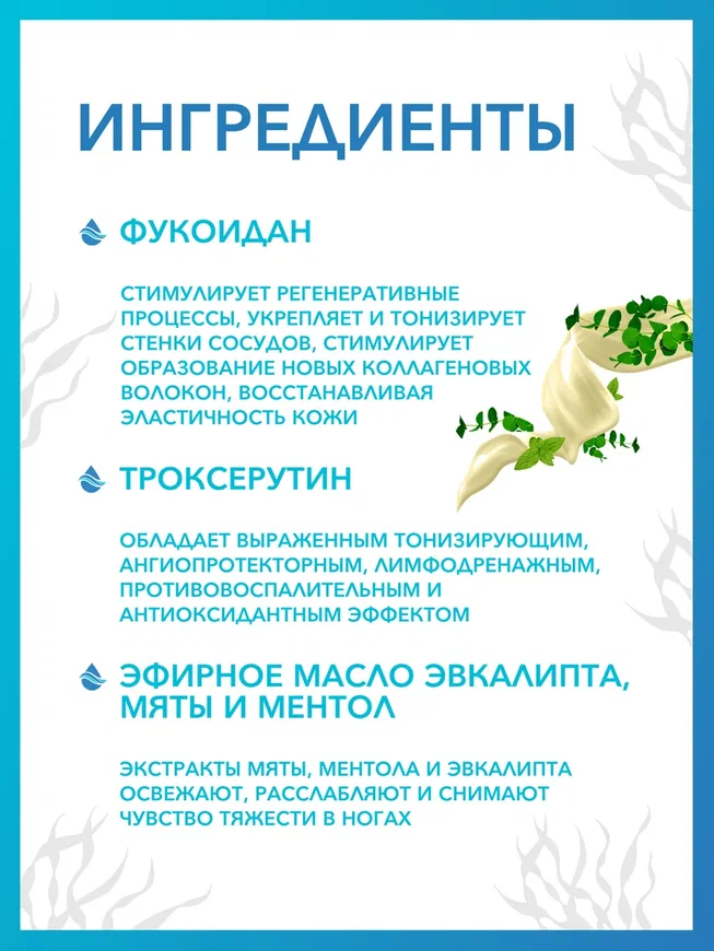 В составе Венофиша фукоидан стимулирует регенеративные процессы, укрепляет и тонизирует стенки сосудов, стимулирует образование новых коллагеновых волокон, восстанавливая эластичность кожи.