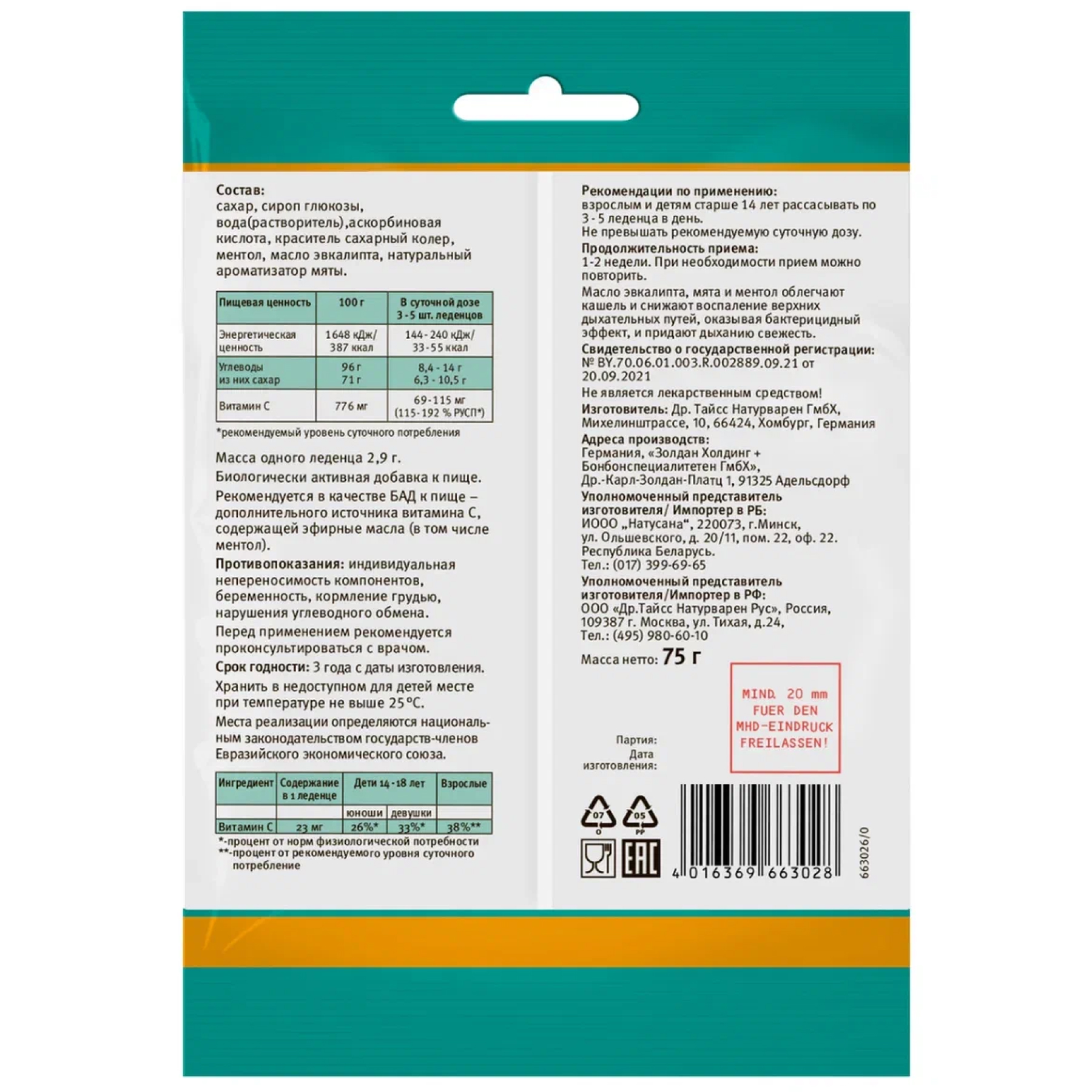 Эвкалиптовое масло и ментол обладают бактерицидным действием, смягчают кашель и раздражение верхних дыхательных путей, освежают и придают дыханию длительную свежесть. Рекомендуются в качестве источника витамина С и эфирных масел.