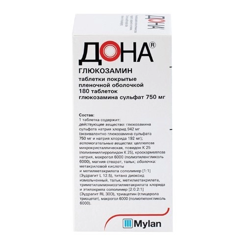 Активное вещество: глюкозамина сульфата натрия хлорид 942 мг, в т.ч. глюкозамина сульфата 750 мг, натрия хлорида 192 мг.