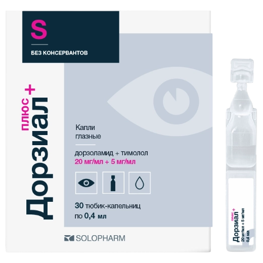 Препарат содержит два активных компонента: дорзоламида гидрохлорид и тимолола малеат, каждый из которых уменьшает повышенное внутриглазное давление за счет снижения секреции внутриглазной жидкости. Совместное действие этих веществ в составе комбинированного препарата Дорзиал плюс приводит к более выраженному снижению внутриглазного давления.