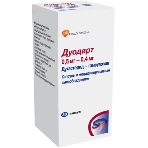Препарат Дуодарт представляет собой комбинацию двух компонентов с взаимодополняющими механизмами действия, способствующих устранению симптомов у пациентов с доброкачественной гиперплазией предстательной железы (ДГПЖ): двойного ингибитора 5α-редуктазы - дутастерида и блокатора α1a-адренорецепторов - тамсулозина гидрохлорида.