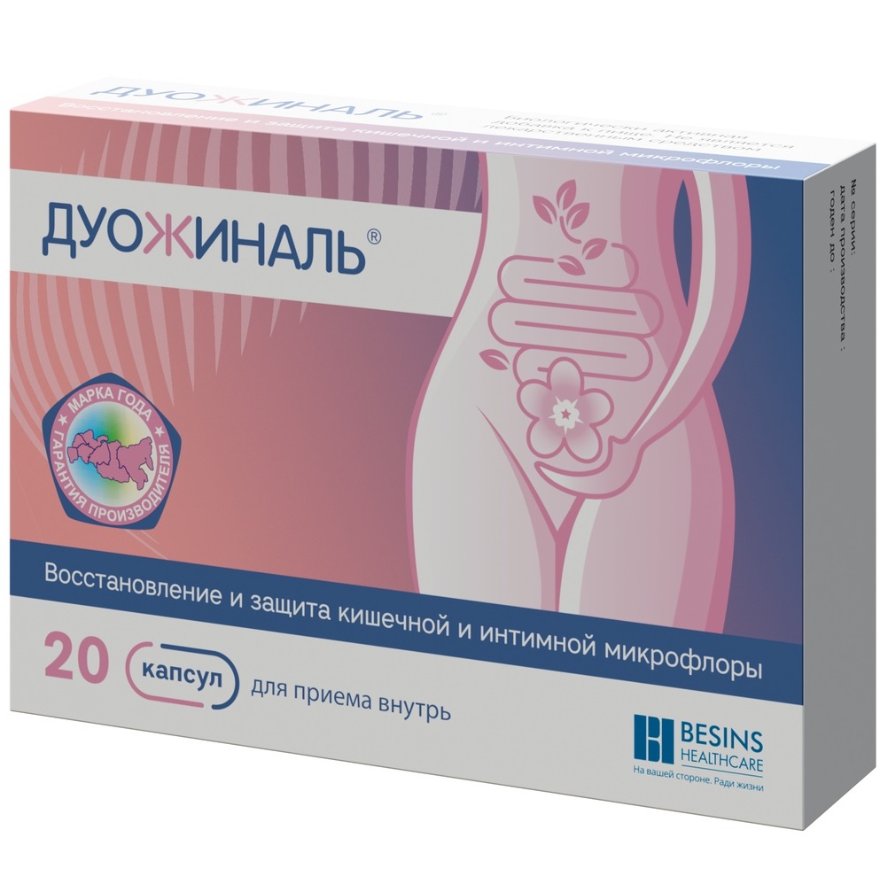 Кроме того, назначение системных антибактериальных препаратов вызывает значительные нарушения нормального состава и функциональных свойств кишечного микробиома с избыточным размножением условно-патогенных микроорганизмов особенно при одновременном приеме с противомикробными препаратами. При этом любой антибиотик потенциально может вызвать антибиотик-ассоциированную диарею. Капсулы Дуожиналь® способствуют увеличению числа полезных лактобактерий, нормализующих вагинальную микрофлору у женщин. Дуожиналь® содержит 2 штамма молочнокислых бактерий Lactobacillus rhamnosus HN001 и Lactobacillus acidophilus La-14, которые способны колонизировать влагалище при пероральном применении и сохраняться там через неделю после окончания приема. [2, 7]. В исследованиях invitro было показано, при совместном культивировании комбинации этих штаммов лактобактерий с аэробными и анаэробными микроорганизмами (Gardenerella vaginalis, Atopobium vaginae, Staphylococcus aureus, Escherichia coli) происходит полная элиминация патогенов в течение 12 часов [1]. При совместном культивировании Lactobacillus rhamnosus HN001 и Lactobacillus acidophilus La-14 (как по отдельности, так и совместно) с условно-патогенными штаммами кишечного происхождения (Escherichia coli, Klebsiella pneumoniae, Klebsiella oxytoca, Enterobacter asburae, Proteus mirabilis, Citrobacter freundii, Staphylococcus aureus, Enterococcus faecalis, Streptococcus agalactiae и Candida albicans) отмечена гибель микроорганизмов, то есть выявлены выраженные антагонистические взаимоотношения между ними [12]. После вагинальной колонизации лактобациллы могут различными способами противодействовать размножению условно-патогенных или патогенных микроорганизмов, способны конкурировать с другими бактериями как за питательные вещества, так и за места адгезии к эпителию влагалища. Кроме того, они оказывают антимикробное действие, продуцируя молочную кислоту, которая уменьшает рН влагалища и продуцируют растворимые молекулы, включая пероксид водорода и бактериоцины, способные оказывать бактериоцидные эффекты, разрушая биопленки патогенных микроорганизмов либо ингибируя активность ферментов (например, сиалидаз и пролидаз), необходимых для бактериальной вирулентности [7]. Штаммы Lactobacillus acidophilus La-14 и Lactobacillus rhamnosus HN001 в исследовании invitro при совместном культивировании продемонстрировали свою устойчивость антибактериальным препаратам [12], что позволяет их использовать параллельно с противомикробной терапией. Результаты клинических исследований показали активность лактобактерий, входящих в состав Дуожиналя, в восстановлении нормальной микрофлоры влагалища и профилактике бактериального вагиноза и кандидозного вульвовагинита [8, 9]. Применение Дуожиналя у женщин с промежуточным типом микрофлоры (умеренное или сниженное количество лактобактерий, субклиническое течение) может восстанавливать микрофлору влагалища и нормализовать количество лактобациллярной флоры, препятствуя развитию дисбиозов и вагинитов [7, 10] без применения антибактериальных средств. Лактобактерии могут использоваться для восстановления и поддержания нормальной микрофлоры, pH влагалища и кишечника, а также для восстановления местного иммунитета при следующих состояниях: