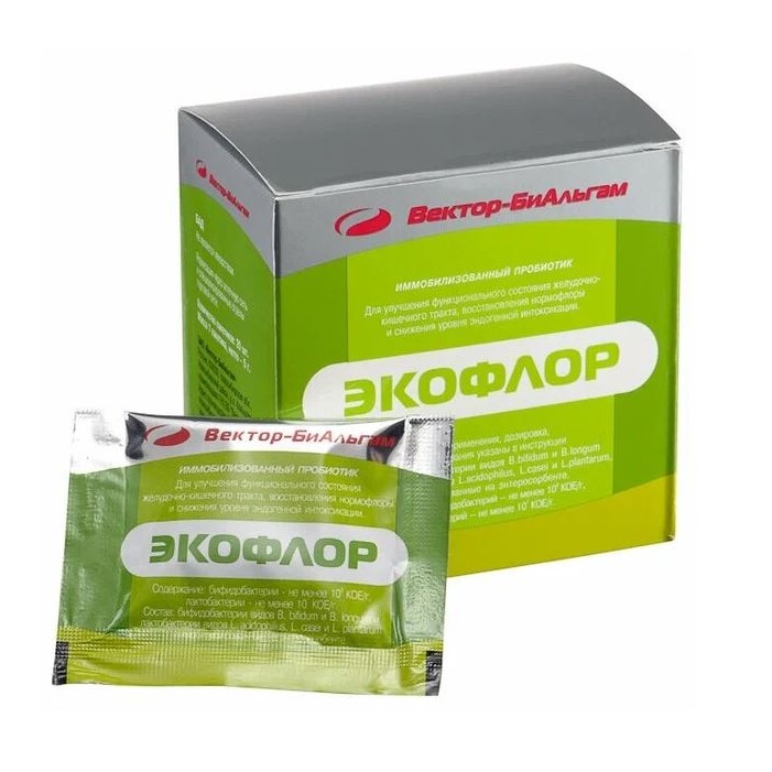 Препарат «Экофлор» (Патент РФ №2371479 от 27.10.09, Патент РФ №2317089 от 20.02.08) является биологически активной добавкой - пробиотиком нового поколения, представляющим собой консорциум живых антагонистически активных штаммов бифидо- и лактобактерий, иммобилизованных на энтеросорбенте.