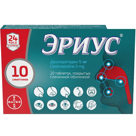 Препарат Эриус® применяется у взрослых и детей старше 12 лет при аллергическом рините (устранении или облегчении чихания, заложенности носа, выделения слизи из носа, зуда в носу, зуда неба, зуда и покраснения глаз, слезотечения); крапивнице (уменьшении или устранении кожного зуда, сыпи).