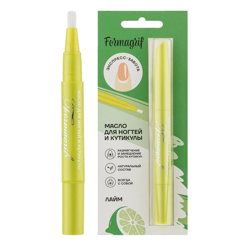 Formagrif масло для ногтей и кутикулы лайм 1,8 мл - применяется для домашнего ежедневного ухода за кутикулой и около ногтевой кожей. Эфирное масло лайма и эфирное масло лимона оказывают бактерицидное и антисептическое действие, а также регенерирующее и успокаивающее действие. Благодаря рисовому маслу, входящему в состав, косметическое масло обладает регенерирующими, укрепляющими и защитными свойствами. Масло сладкого миндаля и авокадо обладает смягчающими и питательными свойствами. Масло абрикосовых косточек обладает уникальными целебными свойствами. Благодаря присутствию в нем активной формы редкого витамина F, уникальных токоферолов и соли магния, калия, цинка оно славиться своими питательными и витаминизирующими свойствами. Масло макадамии является источником пальмитиновой кислоты. Кроме того, в нем содержаться незаменимые витамины РР и всей группы В, линолевая, линоленовая, олеиновая, арахидоновая, эйкозеновая, стеариновая кислоты. Благодаря сочетанию всех ценных масел и витаминов косметическое масло оказывает антисептическое и успокаивающее действие на кожу и ногтевые впадины, устраняет сухость кутикулы, укрепляет тонкую ногтевую пластину, замедляет рост кутикулы, предотвращает образование заусенцев.