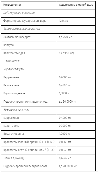 Терапевтический диапазон доз формотерола составляет от 12 мкг до 24 мкг 2 раза в день. Данные по фармакокинетике формотерола в плазме крови получены у здоровых добровольцев после ингаляции формотерола в дозах, превышающих рекомендуемые, и у пациентов с ХОБЛ после ингаляции формотерола в терапевтических дозах. Системную экспозицию оценивали косвенно по выведению неизменного формотерола почками, которое коррелирует с плазменным распределением формотерола. Период полувыведения, рассчитанный по моче и плазме крови, был сходным.
