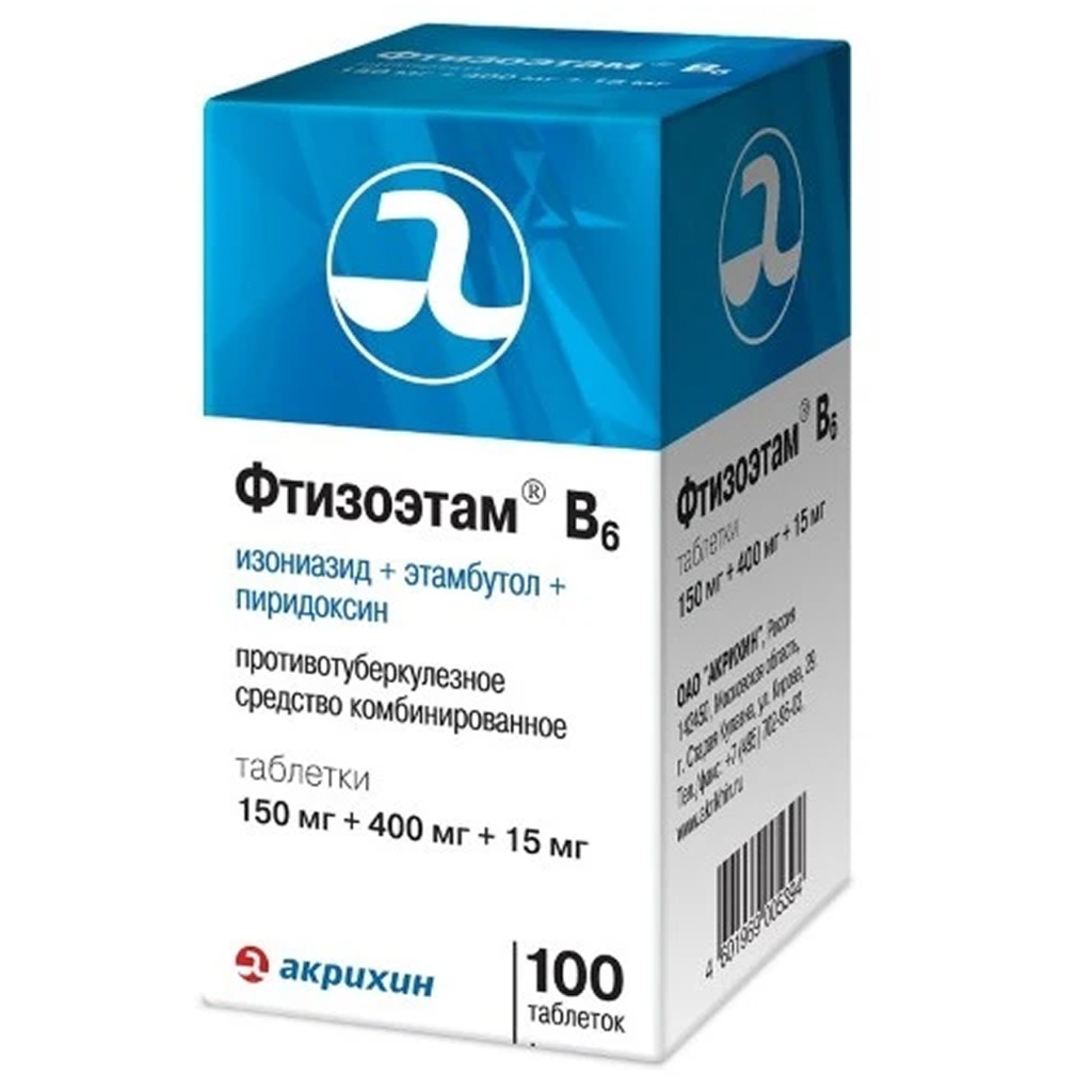 Действующие вещества: изониазид в пересчете на 100% вещество - 150 мг, этамбутола гидрохлорид в пересчете на 100% вещество - 400 мг, пиридоксина гидрохлорид в пересчете на 100% вещество - 15 мг;