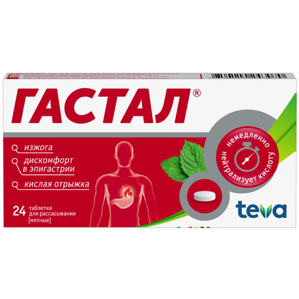 Антацидное действие препарата проявляется сразу после приема таблеток Гастала и продолжается около 2 ч. 1 таблетка Гастала нейтрализует около 21.5 ммоль соляной кислоты. Гастал ингибирует действие пепсина, лизолецитина и желчных кислот, таким образом, также устраняя расстройства функции желудка.