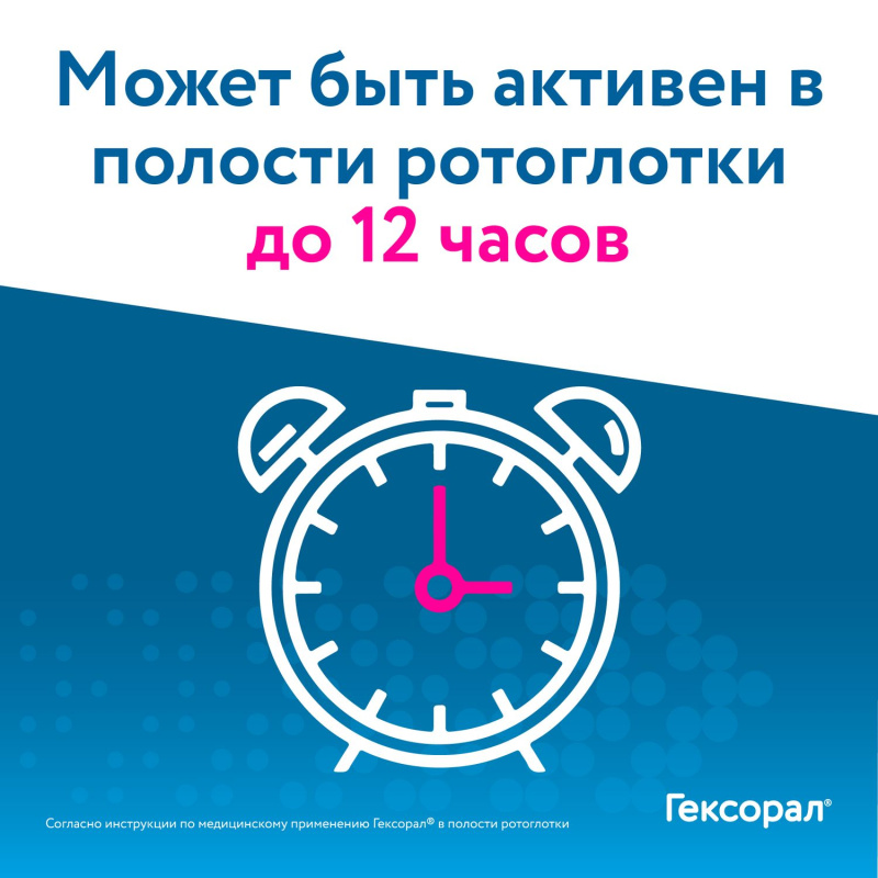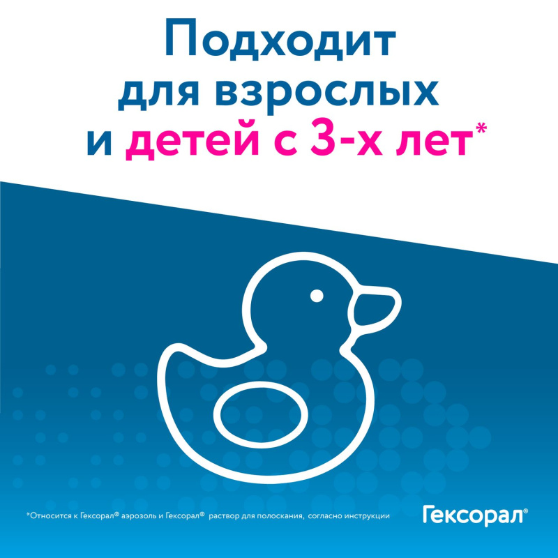 Гексорал® - это современное средство от боли в горле для взрослых и детей с 3-х лет, созданое для терапии симптомов таких заболеваний, как ОРЗ, ОРВИ, фарингит, тонзиллит и ангина, стоматит, пародонтоз, грибковые заболевания, а также гигиена полости рта, в т. ч. и для устранения неприятного запаха изо рта. Гексорал® способен бороться с большинством типов распространенных возбудителей инфекционных заболеваний полости рта и глотки: вирусами, бактериями, грибами и биопленками (1). Гексорал® проникает в очаг инфекции через 1-2 секунды (2). ОСНОВНЫЕ ПРЕИМУЩЕСТВА Линейка Гексорал® включает в себя: аэрозоль, раствор для полоскания полости рта и таблетки для рассасывания. Аэрозоль обладает антисептическим, противовирусным и противомикробным свойством. Гексорал® проникает в очаг инфекции через 1-2 секунды (2) и подходит для лечения боли в горле любой интенсивности взрослым и детям с 3х лет. Подходит для лечения боли в горле, простуды, першения, фарингита, тонзиллита, ангины. Семейный формат: Гексорал в семейной упаковке с 4 индивидуальными насадками. Теперь каждый член семьи, вне зависимости от возраста, точно будет знать и не перепутает «свою» насадку, а это значит, что при применении спрея инфекция не распространится от одного к другому. Европейское качество лекарства от боли в горле. Гексорал — оригинальный препарат, с проверенным качеством, который производится во Франции. ДРУГОЕ В состав препарата входят: Гексэтидин рекомендован (3) как средство для лечения детей с острым тонзиллитом Способ применения: Гексорал® распыляют в полости рта или глотке. С помощью аэрозоля можно легко и быстро обработать пораженные участки. Необходимо выполнить следующие действия: 1. Для начала наденьте на аэрозольный баллон насадку- распылитель и направьте ее конец на пораженный участок полости рта или глотки. 2. Обязательно держите флакон в вертикальном положении во время введения препарата. 3. Задержите ненадолго дыхание, надавите на головку насадки-распылителя и удерживайте ее в таком положении в течение 1–2 секунд. Это время соответствует введению однократной дозы препарата. 4. Если специалист не дал иных рекомендаций, средство применяется 2 раза в день – утром и вечером. 5. Длительность лечения должен определить специалист. ССЫЛКИ 1. Еще раз о термине «вирусно-бактериальная инфекция», А.С. Полякова, к.м.н. В.К. Таточенко, д.м.н., профессор, Научный центр здоровья детей, г. Москва, Медицинский совет, 2015 № 14 2. Согласно инструкции, аэрозоль распыляется в течение 1-2 секунд. Не является временем действия на симптомы. 3. Клинические рекомендации «Острый тонзиллит у детей», 2016 г.