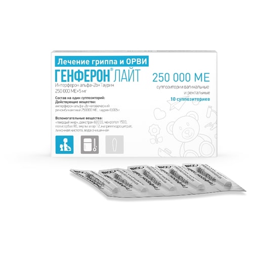 Активные вещества: интерферон альфа-2b - 250 000 ME; таурин - 0,005 г;
