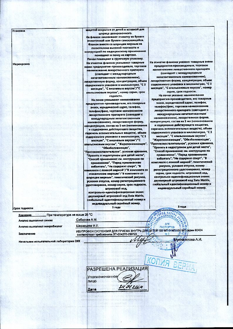 Для приема внутрь. 5 мл препарата содержат 100 мг ибупрофена (20 мг ибупрофена в 1 мл).