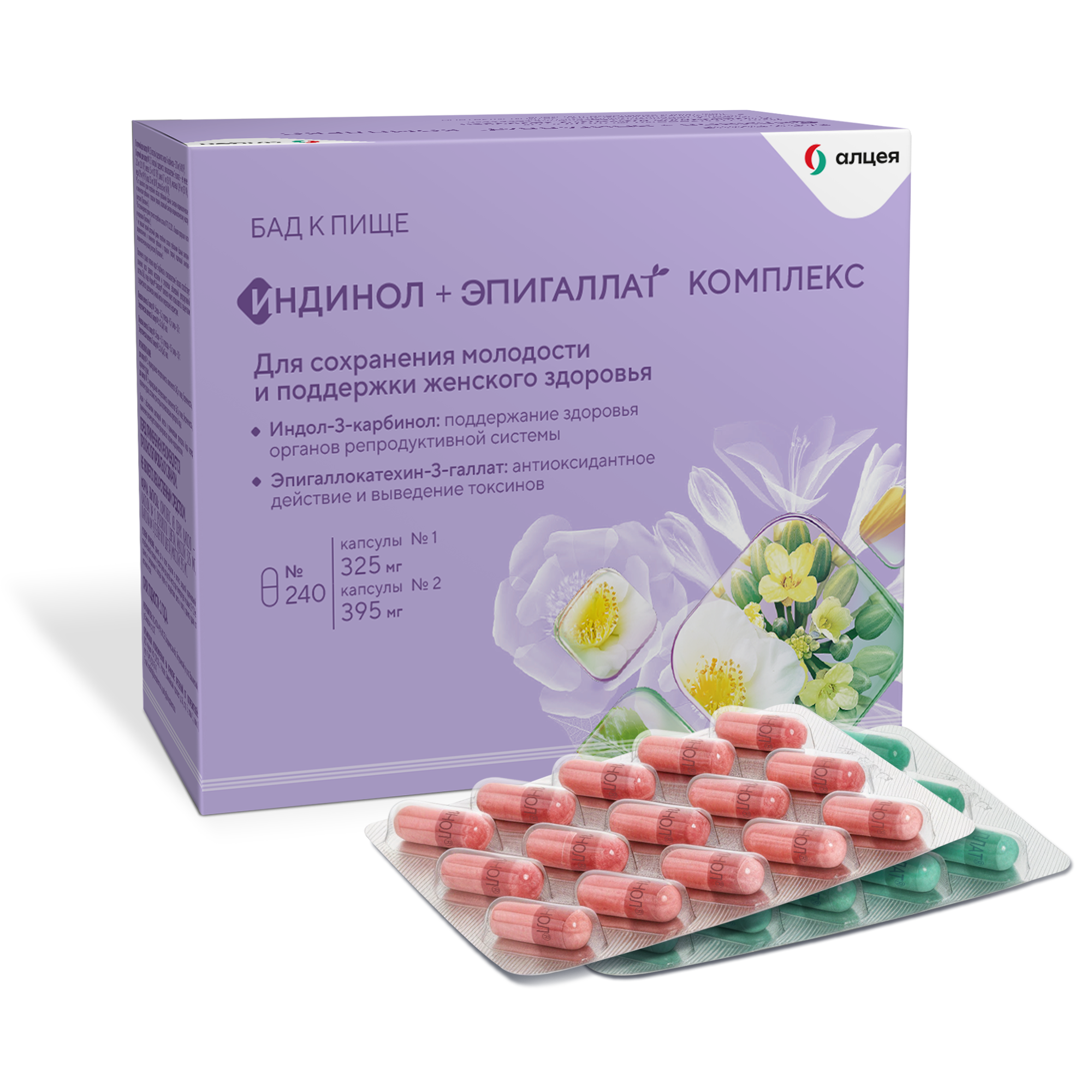 Упаковка содержит капсулы биологически активных добавок двух видов: Индинол® и Эпигаллат®.