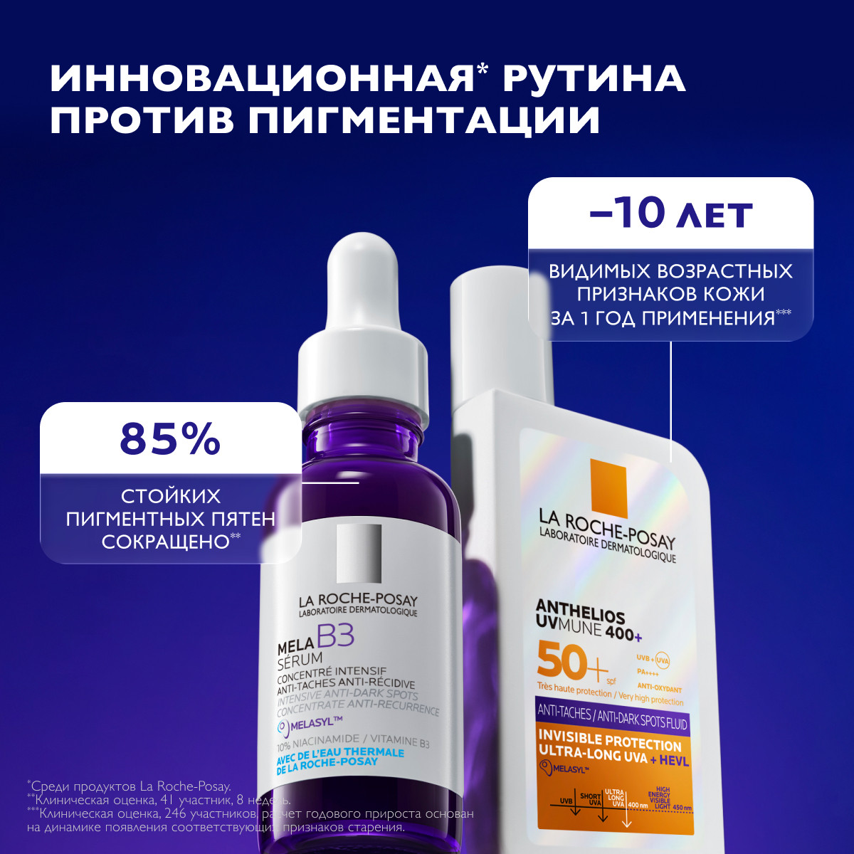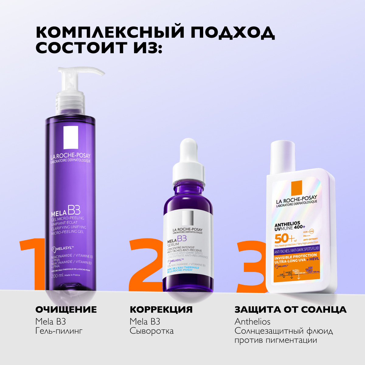 Солнцезащитный флюид Anthelios UVMUNE 400+ с SPF 50+ обеспечивает очень высокую степень защиты от широкого спектра UV-лучей (UVB+UVA) и гиперпигментации. Комплекс запатентованных компонентов обеспечивает исключительную эффективность.