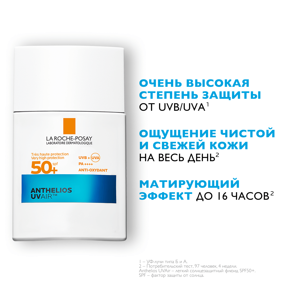 Cолнцезащитный флюид для лица Anthelios UVAir SPF50+ / PA++++ - это эффективная защита от солнца, теперь такая же легкая, как воздух!* Средство обеспечивает ежедневную защиту кожи от агрессивных внешних факторов. Очень высокая степень защиты от UVB/UVA. Помогает предотвратить оксидативный стресс, вызванный IR-излучением и загрязнением воздуха.