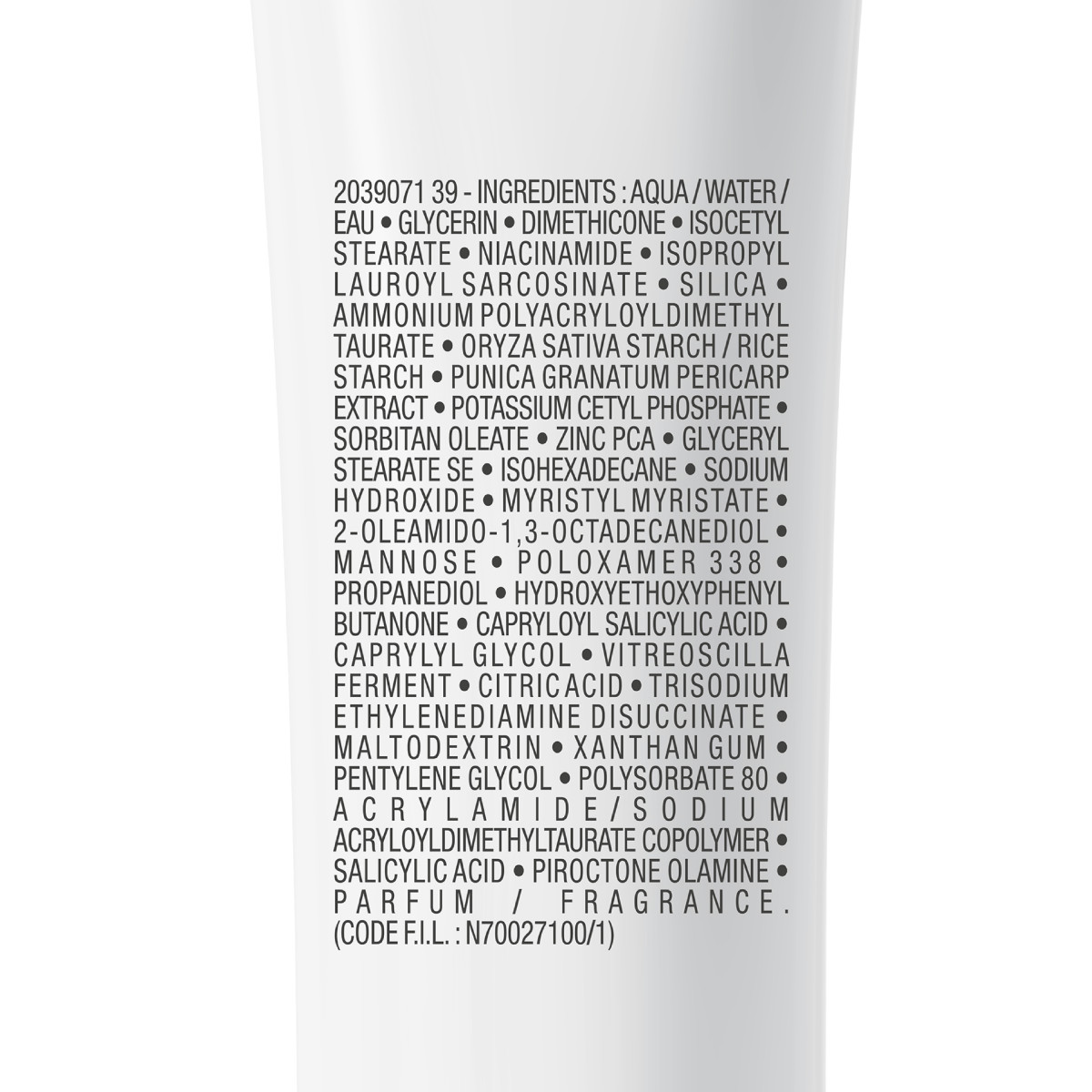 AQUA / WATER (вода), GLYCERIN (глицерин), DIMETHICONE, ISOCETYL STEARATE, NIACINAMIDE (ниацинамид), ISOPROPYL LAUROYL SARCOSINATE, SILICA, AMMONIUM POLYACRYLOYLDIMETHYL TAURATE, METHYL METHACRYLATE CROSSPOLYMER, POTASSIUM CETYL PHOSPHATE, SORBITIAN OLEATE, ZINC PCA (цинк), GLYCERYL STEARATE SE, ISOHEXADECANE, SODIUM HYDROXIDE, MYRISTYL MYRISTATE, 2-OLEAMIDO-1,3-OCTADECANEDIOL, ALUMINUM STARCH OCTENYLSUCCINATE, MANNOSE (манноза), POLOXAMER 338, DISODIUM EDTA, CAPRYLOYL SALICYLIC ACID, CAPRYLYL GLYCOL, VITREOSCILLA FERMENT, XANTHAN GUM, POLYSORBATE 80, ACRYLAMIDE / SODIUM ACRYLOYLDIMETHYLTAURATE COPOLYMER, SALICYLIC ACID (салициловая кислота), PIROCTONE OLAMINE (пироктон оламин), PARFUM/FRAGRANCE.