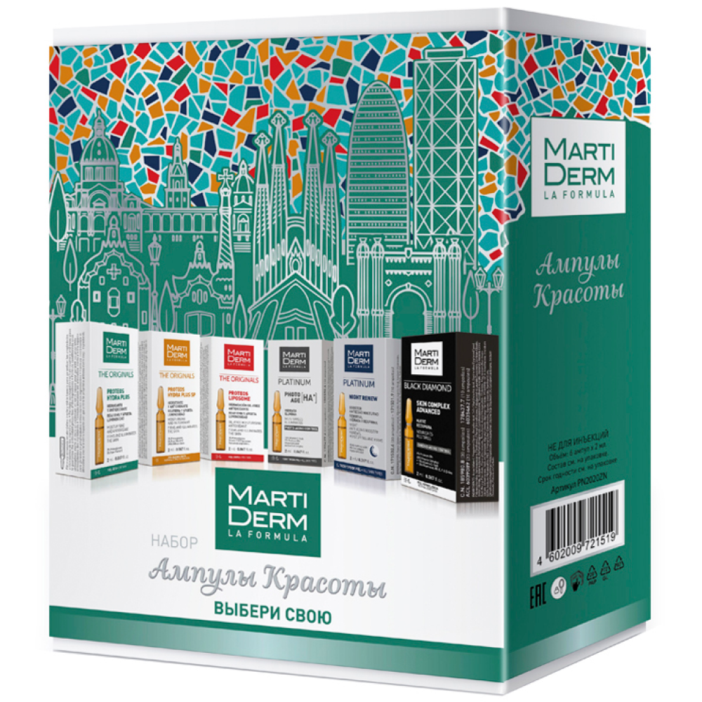 В набор входят 5 видов ампул по 2 мл, благодаря чему есть возможность попробовать и сравнить пять видов текстур сыворотки и подобрать ту, которая подходит именно вашей коже. В подарок идёт тканевая маска.