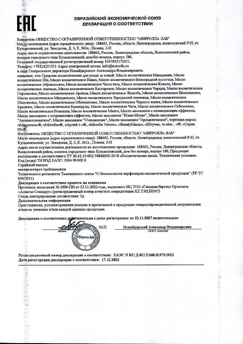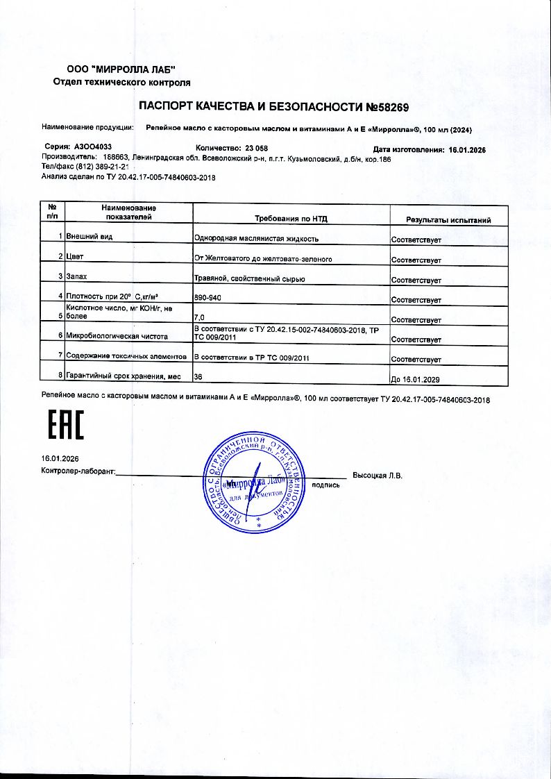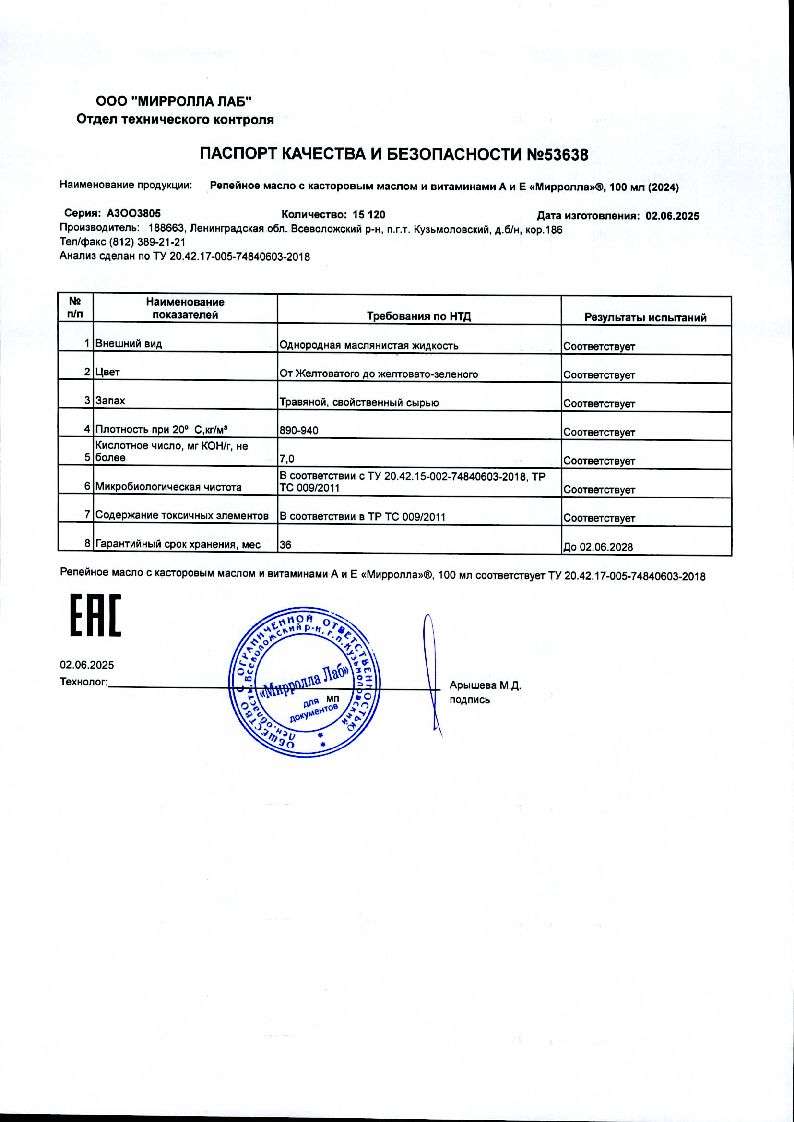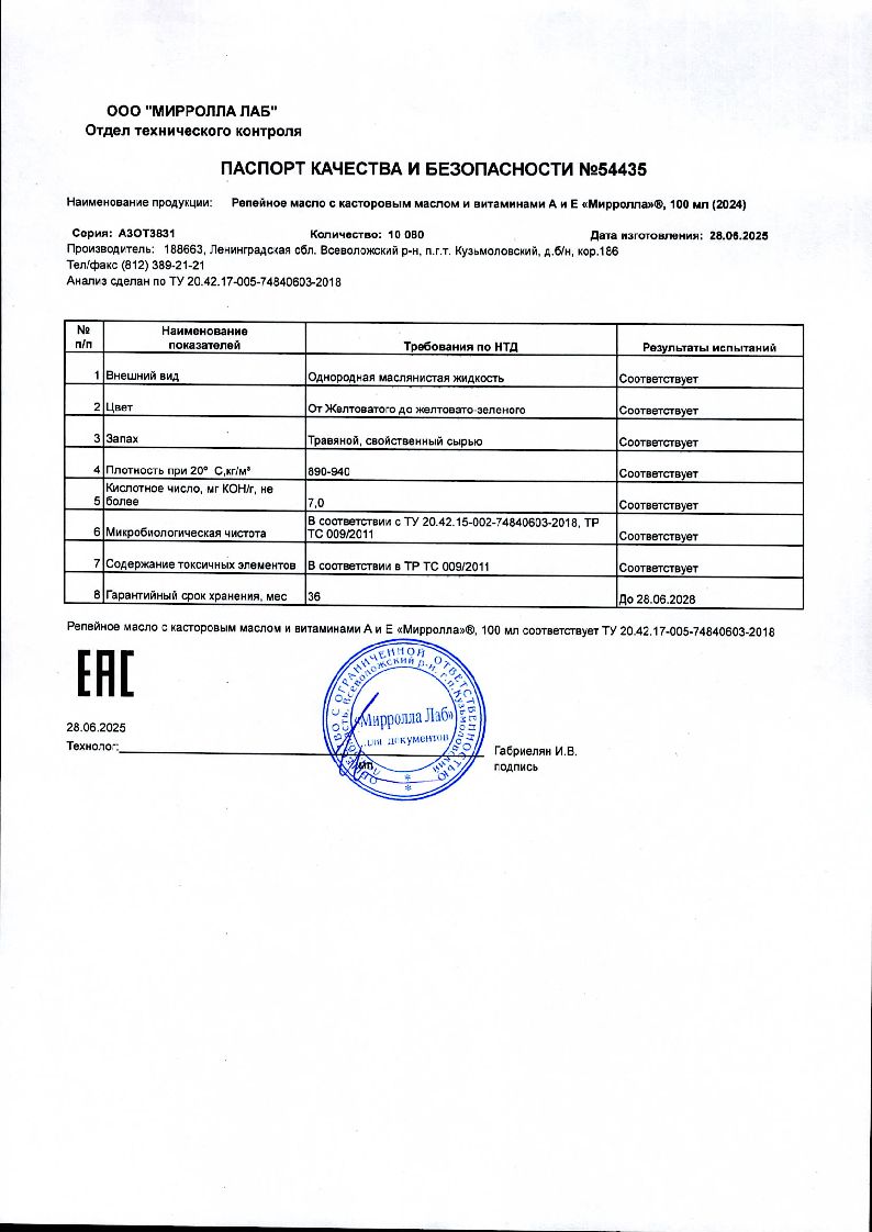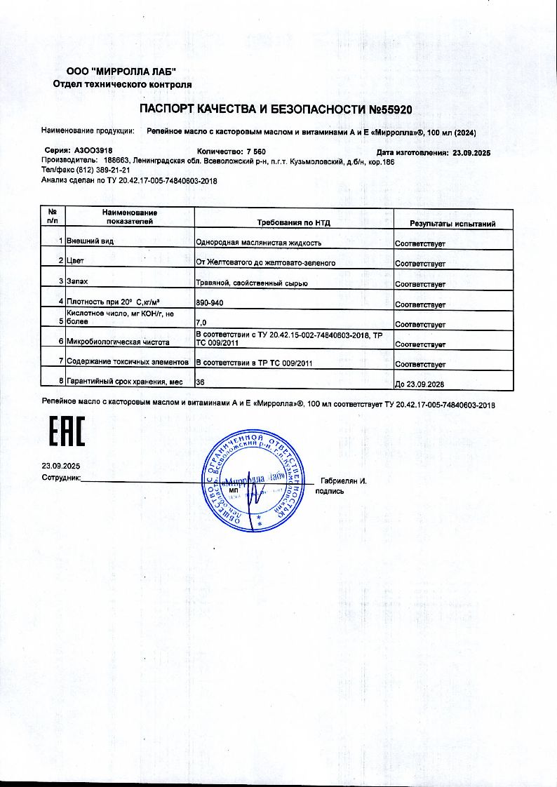 Сертификаты и лицензии “Mirrolla Репейное масло с касторовым маслом и витаминами А и Е 100 мл”