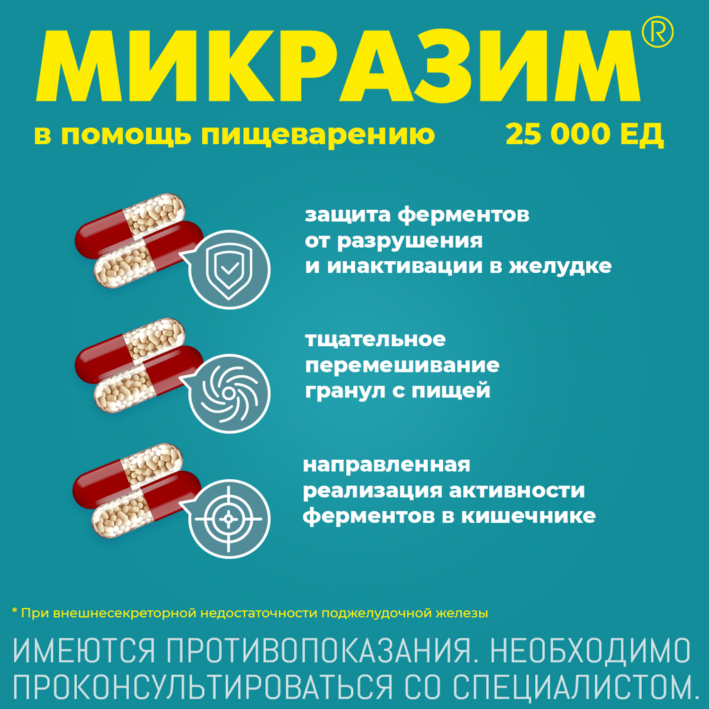 Микразим® содержит панкреатин в виде кишечнорастворимых гранул, в желатиновых капсулах. Капсулы быстро растворяются в желудке, высвобождая гранулы. Данный принцип разработан с целью тщательного перемешивания гранул с химусом, одновременного поступления гранул с химусом из желудка в кишечник, и, в конечном счете, лучшего распределения ферментов после их высвобождения внутри содержимого кишечника.