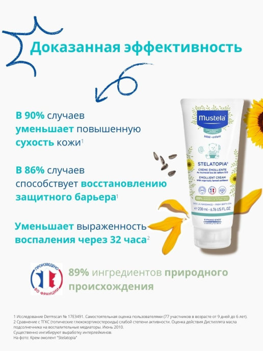 Разработанный специально для сухой кожи младенцев и детей, склонной к атопии, Крем-эмульсия STELATOPIA® восполняет недостаток липидов и успокаивает кожу благодаря сочетанию инновационных активных компонентов природного происхождения. Восстанавливает липиды кожи, благодаря запатентованному процессу Активной Релипидации® ( Relipidation Active®), которая естественным образом стимулирует производство липидов, образующих защитный кожный барьер, количество которых недостаточно на атопической коже. Интенсивно питает кожу, возвращая ей эластичность и мягкость. Питает поверхность кожи за счет притока липидов, образующих защитный барьер кожи. Успокаивает зуд и раздражения. Регулярное использование способствует восстановлению баланса микрофлоры кожи.