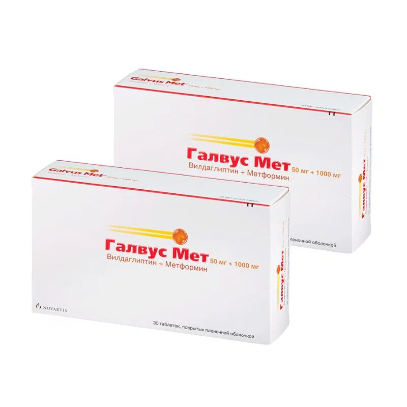 Механизм действия препарата Галвус Мет® заключается в увеличении выработки инсулина и уменьшении выработки глюкагона (эффект вилдаглиптина) в поджелудочной железе, а также повышении эффективности использования инсулина, вырабатываемого в организме (эффект метформина). Препарат Галвус Мет® помогает контролировать уровень сахара в крови.
