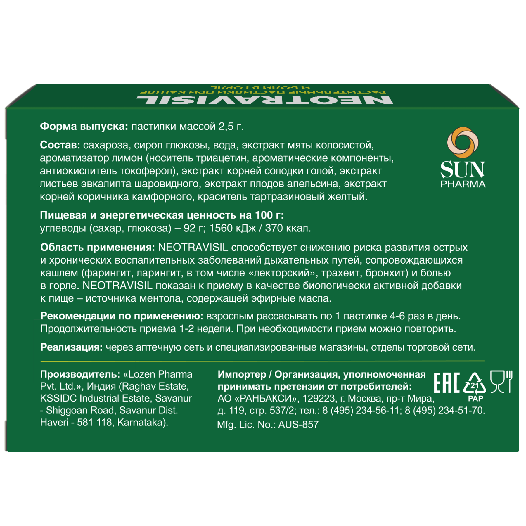 NEOTRAVISIL способствует снижению риска развития острых и хронических воспалительных заболеваний дыхательных путей, сопровождающихся кашлем (фарингит, ларингит, в том числе «лекторский», трахеит, бронхит) и болью в горле. NEOTRAVISIL показан к приему в качестве биологически активной добавки к пище - источника ментола, содержащей эфирные масла.