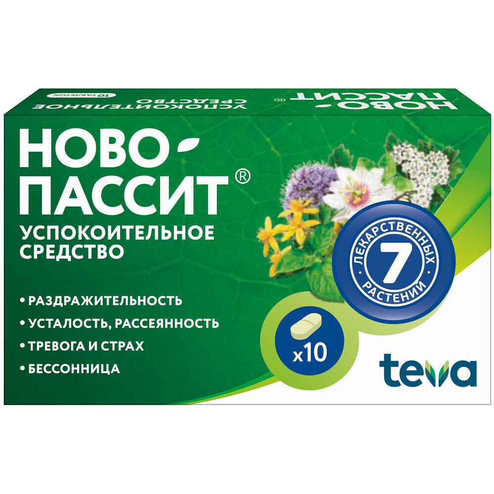 Активные вещества: Ново-Пассит экстракт сухой (получаемый из корневищ с корнями валерианы лекарственной, травы мелиссы лекарственной, травы зверобоя продырявленного, листьев и цветков боярышника однопестичного или колючего, травы пассифлоры инкарнатной (страстоцвета), соплодий хмеля обыкновенного, цветков бузины черной) 157.5 мг, гвайфенезин 200 мг.