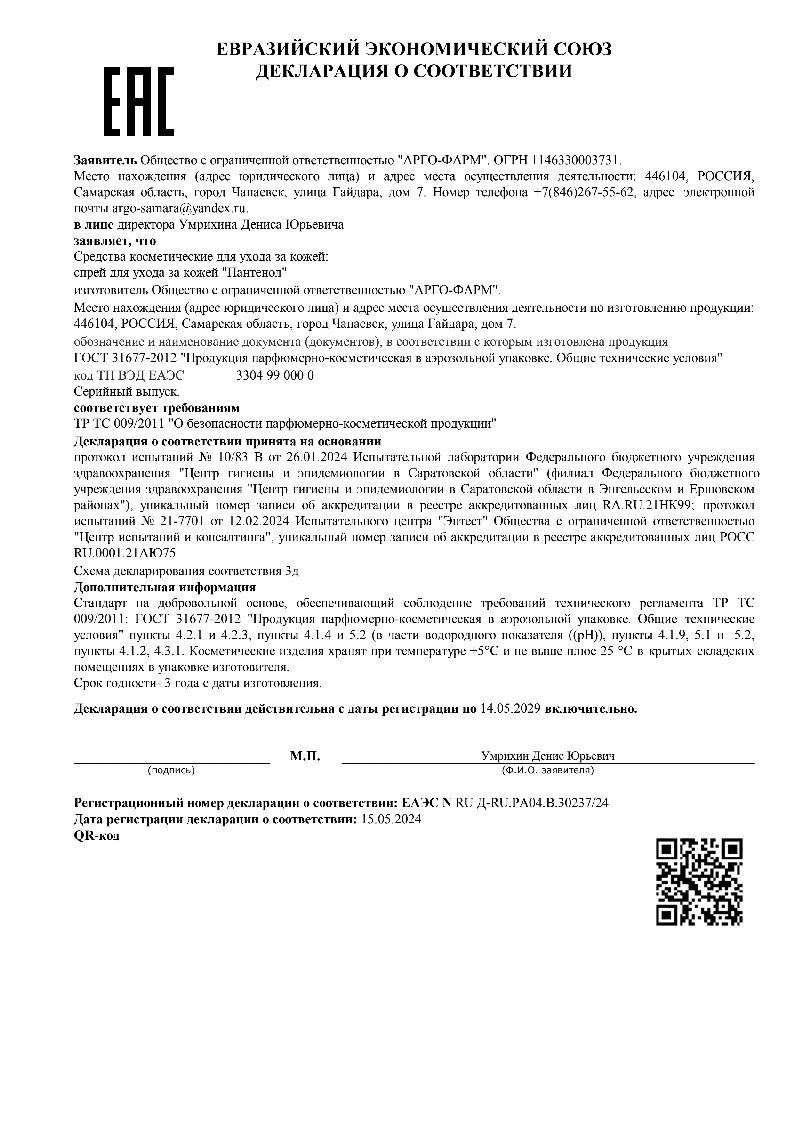 Сертификаты и лицензии “Пантенол 5 % 58 г спрей”