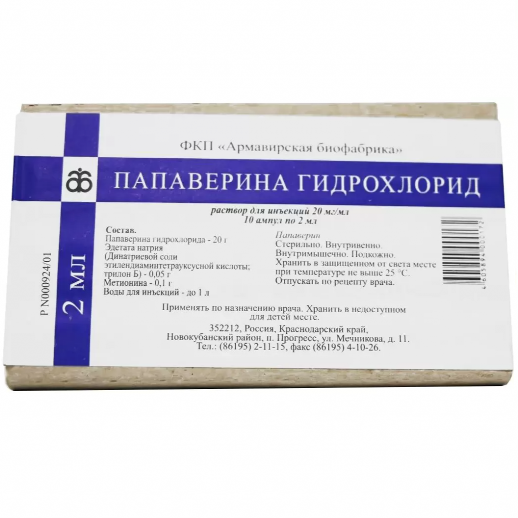 Активное вещество: папаверина гидрохлорид - 20 г,