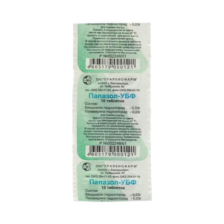 1 таблетка содержит: Активные вещества: бендазола гидрохлорид 30 мг, папаверина гидрохлорид 30 мг; Вспомогательные вещества: лактоза (сахар молочный) - 51,2 мг, повидон (поливинилпирролидон) - 4 мг, крахмал картофельный - 2,4 мг, тальк - 1,2 мг, кальция стеарат - 1,2 мг.