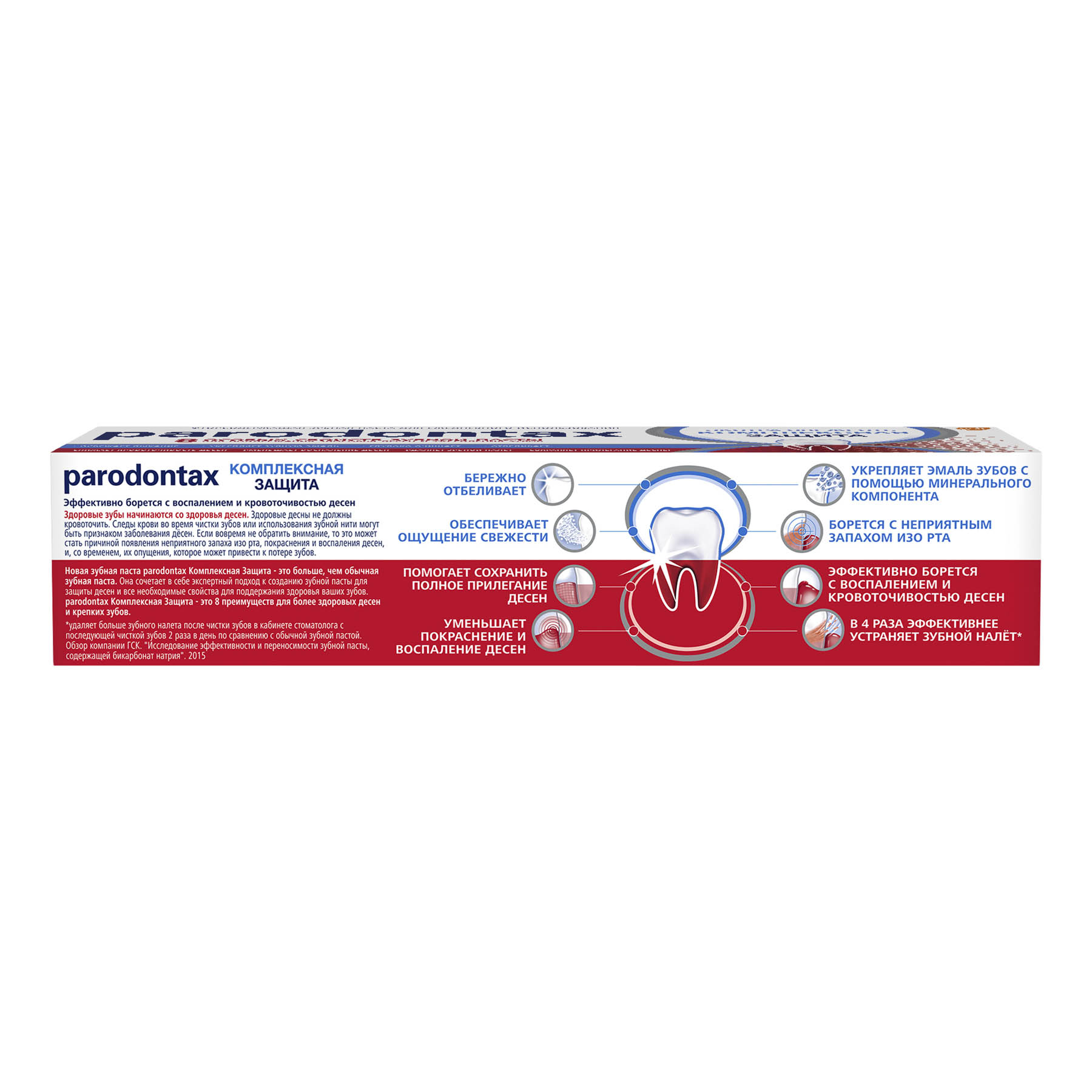 2 Удаляет больше зубного налета после чистки зубов в кабинете стоматолога с последующей чисткой зубов 2 раза в день, по сравнению с обычной зубной пастой. Обзор компании ГСК. «Исследование эффективности и переносимости зубной пасты, содержащей бикарбонат натрия». 2015