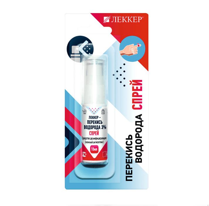Леккер-перекись водорода 3% спрей 10 мл кожный антисептик - это универсальное дезинфицирующее средство на основе перекиси водорода. Средство предназначено: для гигиенической обработки рук медицинского персонала в лечебно-профилактических учреждениях, в машинах скорой медицинской помощи, в зонах чрезвычайных ситуаций; для гигиенической обработки рук работников лабораторий , аптек и аптечных заведений; для гигиенической обработки рук медицинских работников детских дошкольных и школьных учреждений, учебных заведений, учреждений соцобеспечения, для гигиенической обработки рук работников парфюмерно-косметических, фармацевтических и микробиологических предприятий, предприятий пищевой промышленности, общественного питания, торговли. На сухие руки (без предварительного мытья водой и мылом) нанести не менее 3 мл средства и втирать в кожу до высыхания, но не менее 30 сек. При появлении каких-либо раздражений или аллергических реакций немедленно прекратить использование.