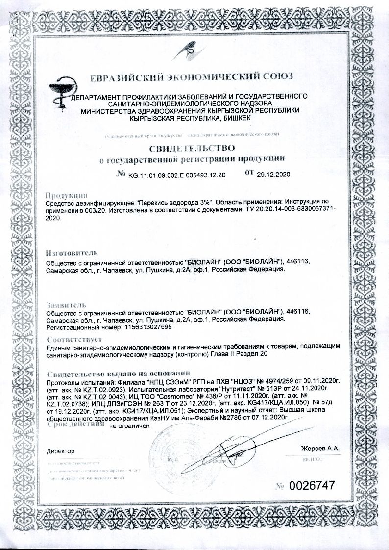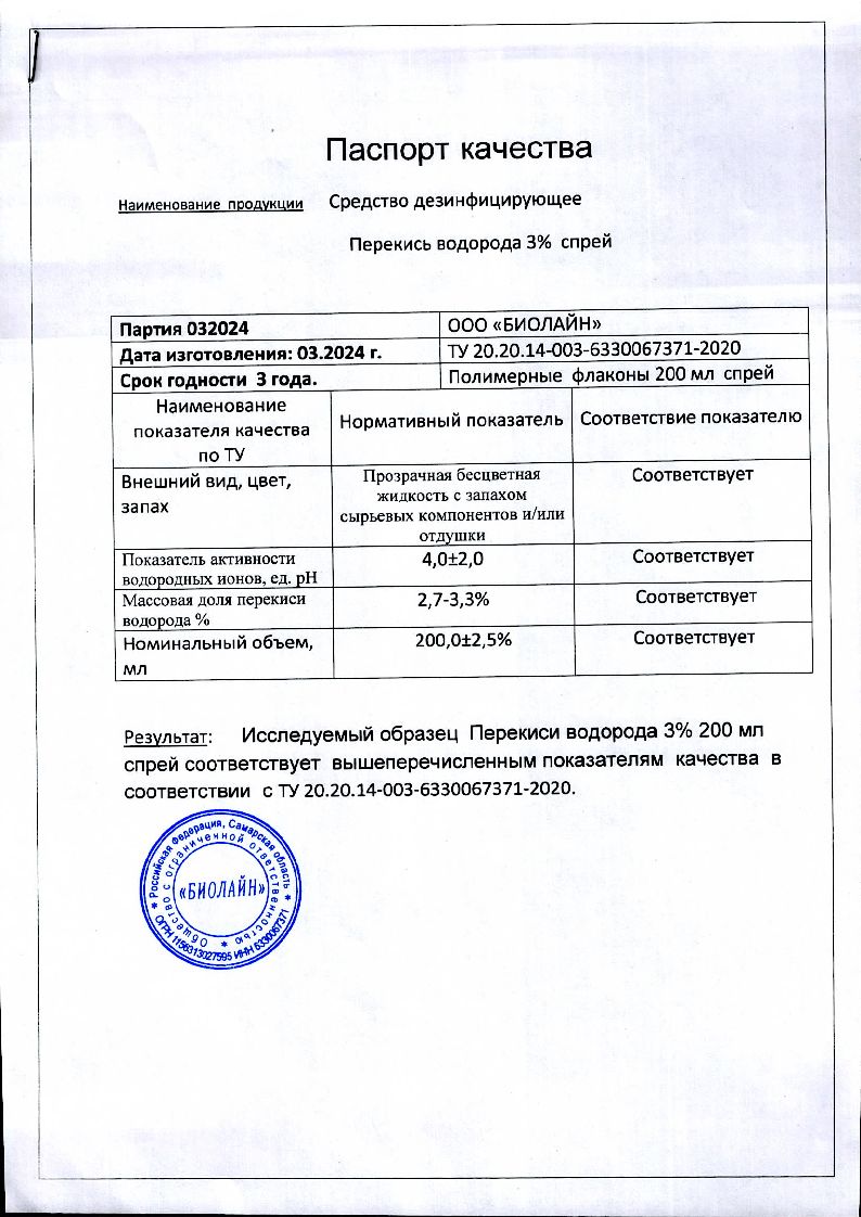 Сертификаты и лицензии “Перекись Водорода 3 % 200 мл спрей флакон”